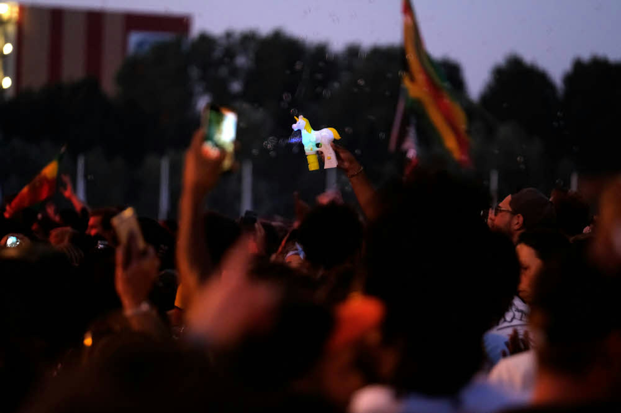 Ein Plastik-Einhorn spuckt Seifenblasen aus