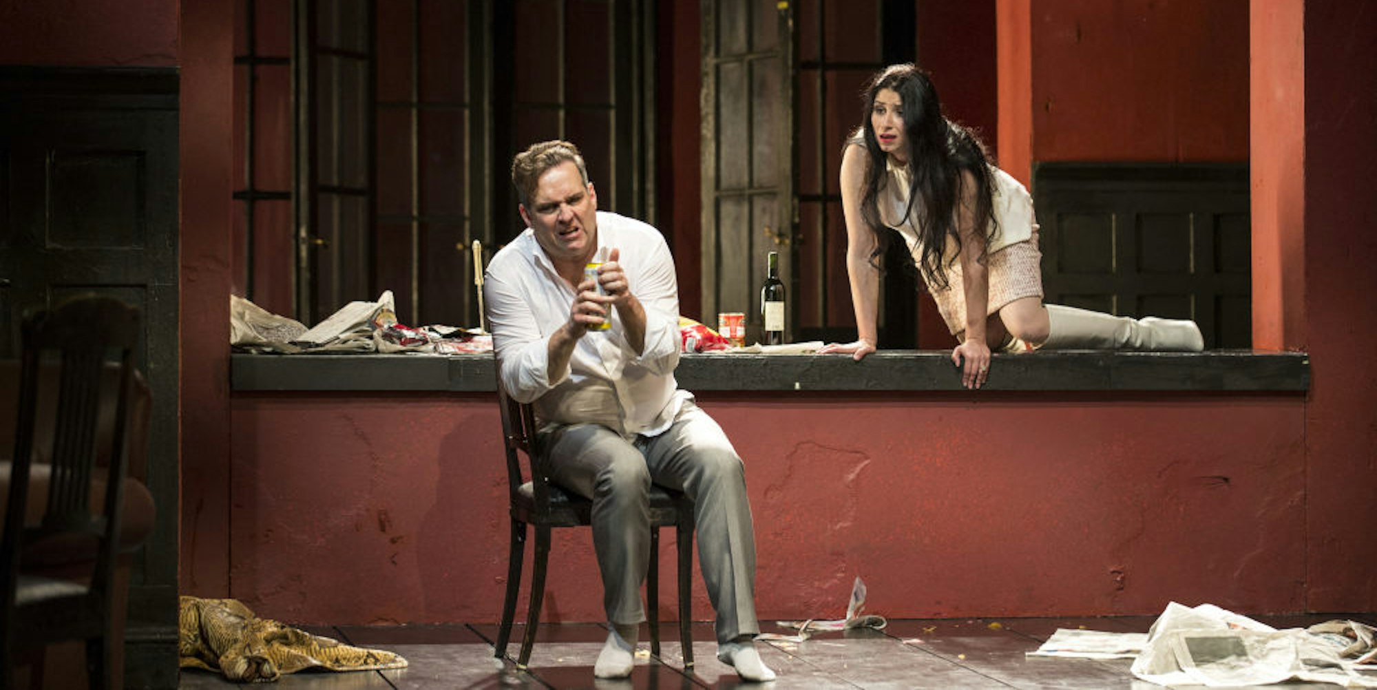 Genau dieser Punkt aber führt auf den Clou der Inszenierung: Der Katastrophenschluss der Oper ist hier in die Gruppensitzung hinein verlegt. Das wird dadurch möglich, dass Azucenas Strategie der Aufarbeitung entgleist und entgleitet – wofür zumal Graf Luna verantwortlich ist, der alle anderen tyrannisiert, gleichsam in Geiselhaft nimmt. Pathologisch verwechselt er zusehends die beiden Ebenen – Vergangenheit und Gegenwart, die auch die der Regie sind. Mit dem Resultat, dass sie im zweiten Teil tatsächlich ineinanderfließen. Das Eifersuchtsdrama aus alten Tagen wird nicht analytisch aufgelöst, sondern wiederholt sich im Zeichen derangierenden Rotweinkonsums – und jetzt mit dem Ausgang, den die Oper vorsieht.