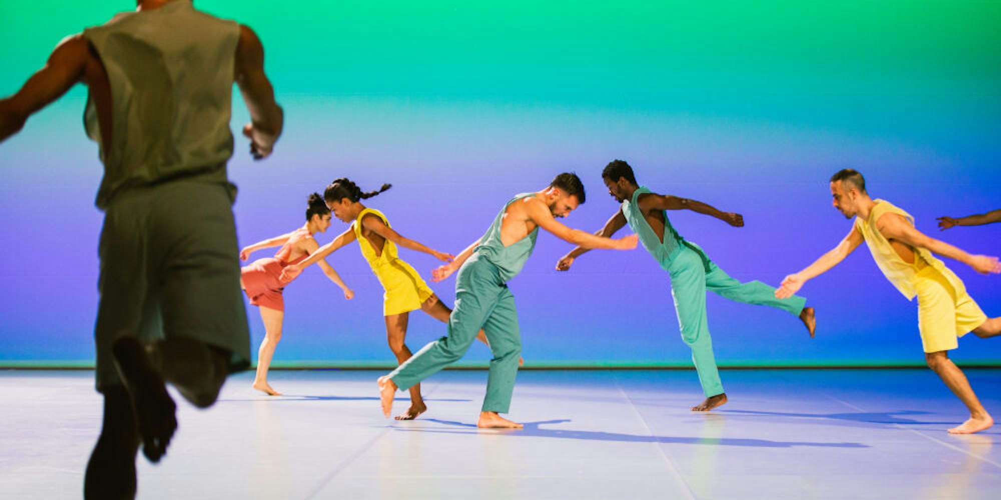 Schon im März hatte Sasha Waltz eine Streaming-Version ihrer Choreografie gezeigt. Jetzt folgte die Bühnen-Uraufführung im Kölner Staatenhaus. Zwölf Tänzer in sommerlich leichten Hosen und Shirts, jeder monochrom in einer anderen Farbe. Sonnengelb, perlrosa, apfelgrün. Farbtöne, die Positives, Schönes assoziieren. Dazu ein 13. Akteur: Die Bühnenrückseite, die im fantastischen Lichtdesign von Olaf Danilsen ständig ihre Färbung ändert und manchmal fast stärker auf die Musik zu reagieren scheint als der Tanz. Drängeln sich sitar-hafte Klänge nach vorn, strahlt die Wand in Osho-Orange und verbreitet Bhagwan-Heiterkeit wie eine ironische Hommage an Hippiebewegung und Indienbegeisterung des Kaliforniers Terry Riley.