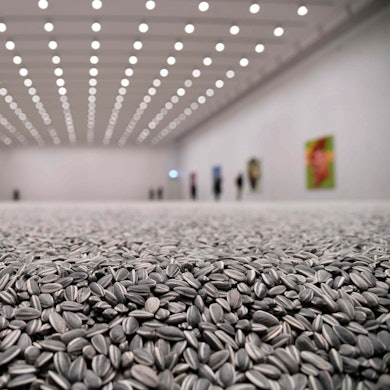 Kontrastreicher könnte der Empfang nicht sein. Hat der alte Mann am Eingang etwa ein Päuschen eingelegt? Oder sitzt er mitten in einem Kunstwerk, auch wenn die überdimensionale Fassade einem Garagentor ähnelt? Worauf wartet er eigentlich? Dass Godot vorbeikommt? Ausgedacht hat sich dieses lebende Bild mit dem Titel „ovoid solitude“ der Kosovo-Albaner Sislej Xhafa. Sein Protagonist ist der kubanische Eierverkäufer Raúl Portillo Samá. Langweilig wird es dem geduldig ausharrenden, aus einem gänzlich anderen Kosmos rausgerissenen Herrn, der tatsächlich hinter seinem Stuhl Pappkartons mit Eiern zum Verkauf bereithält, jedenfalls nicht. Kaum eine Minute vergeht, ohne dass sich einer der Besucher der „Art Unlimited“ nähert, um ein Schwätzchen zu halten. Vielleicht über den Abgrund zwischen den Eier-Preisen und den vielen Nullen eines Richter-Gemäldes? Traditionell ist der Sektor für Kunst im XXL-Format ein Publikumsrenner. Was mitunter schräge Blüten treibt, wenn die Erschöpfung manch einen Kunst-Aficionado dazu verführt, ein Verkaufsobjekt zur Ruhezone umzufunktionieren, wie diesmal etwa die Sitzskulptur „Test“ von Franz West, die gleich am ersten Tag für 3,8 Millionen Dollar verkauft wurde. Die Illusion von Ruhe versprach auch der fünf Meter hohe Sonnenkreis von Ugo Rondinone und wenige Schritte weiter ein Triumphbogen aus frisch duftendem Eukalyptus, den Kapwani Kiwanga aus Ruanda geflochten hatte.