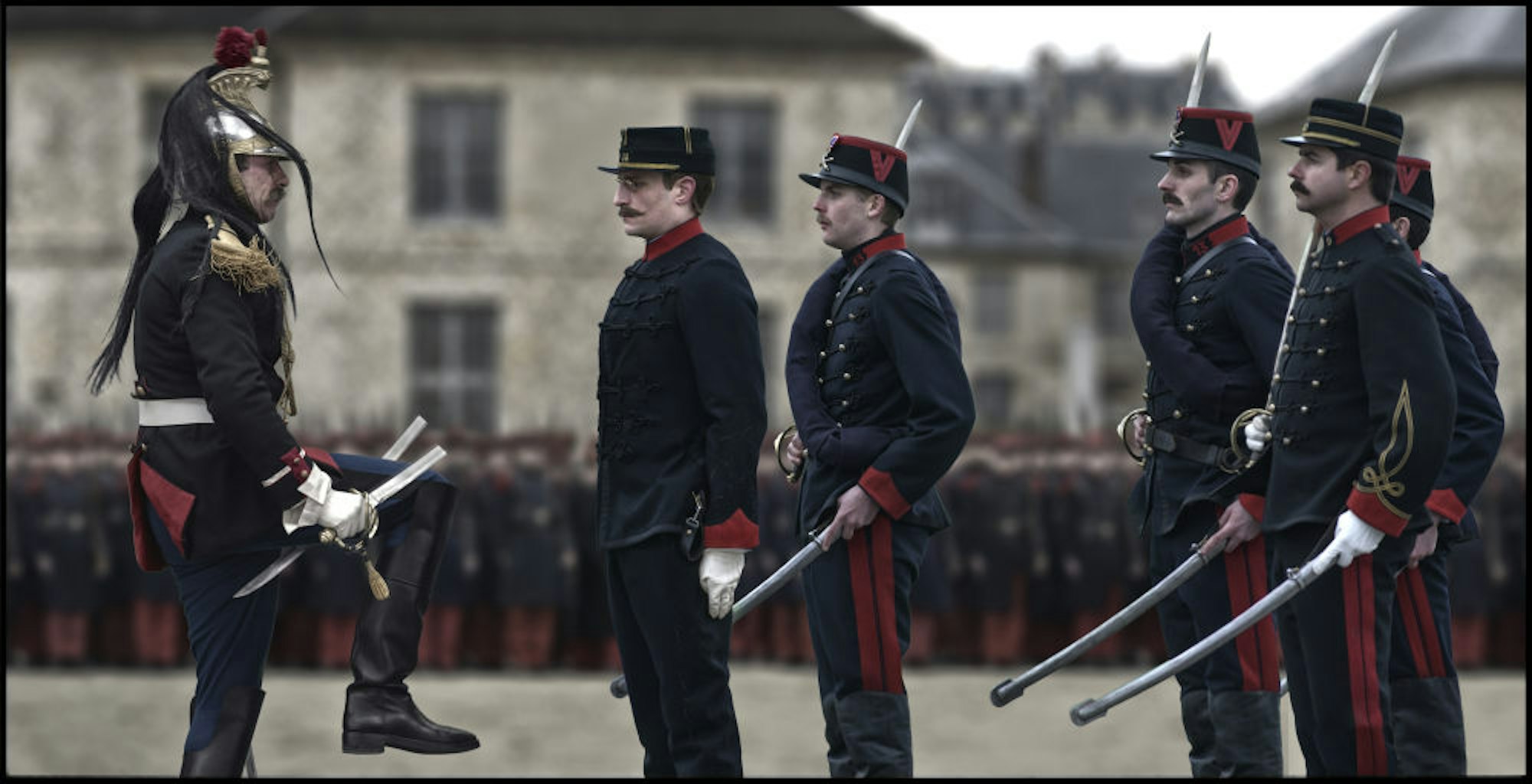 Ein Kernmotiv von „J’Accuse“ sind die Kräfteverhältnisse innerhalb einer autoritär gepolten Gruppe, die in der fieberhaften Suche nach einem Sündenbock und in der Sehnsucht nach Korpsgeist einerseits und andererseits nach Ab- und Ausgrenzung münden. Das wird bereits zum wuchtigen Auftakt des Films deutlich, der von der Degradierung des Hauptmanns erzählt: Hier die Hundertschaften der Soldaten, die wie zu einem einzigen, massiven Körper verdichtet auf dem Hof der Pariser École militaire strammstehen – dort der als Verräter gebrandmarkte Dreyfus, dessen Säbel zerbrochen wird, nachdem man ihm die Epauletten von der Uniform gerissen hat. Ein Mann, dessen soldatisches Ethos ihm verbietet, aus der Rolle zu fallen, und der doch das innere Beben nicht ganz verbergen kann, als er auf dem Höhepunkt der schändlichen Zeremonie gezwungen wird, die Reihen der einstigen Kameraden abzuschreiten.