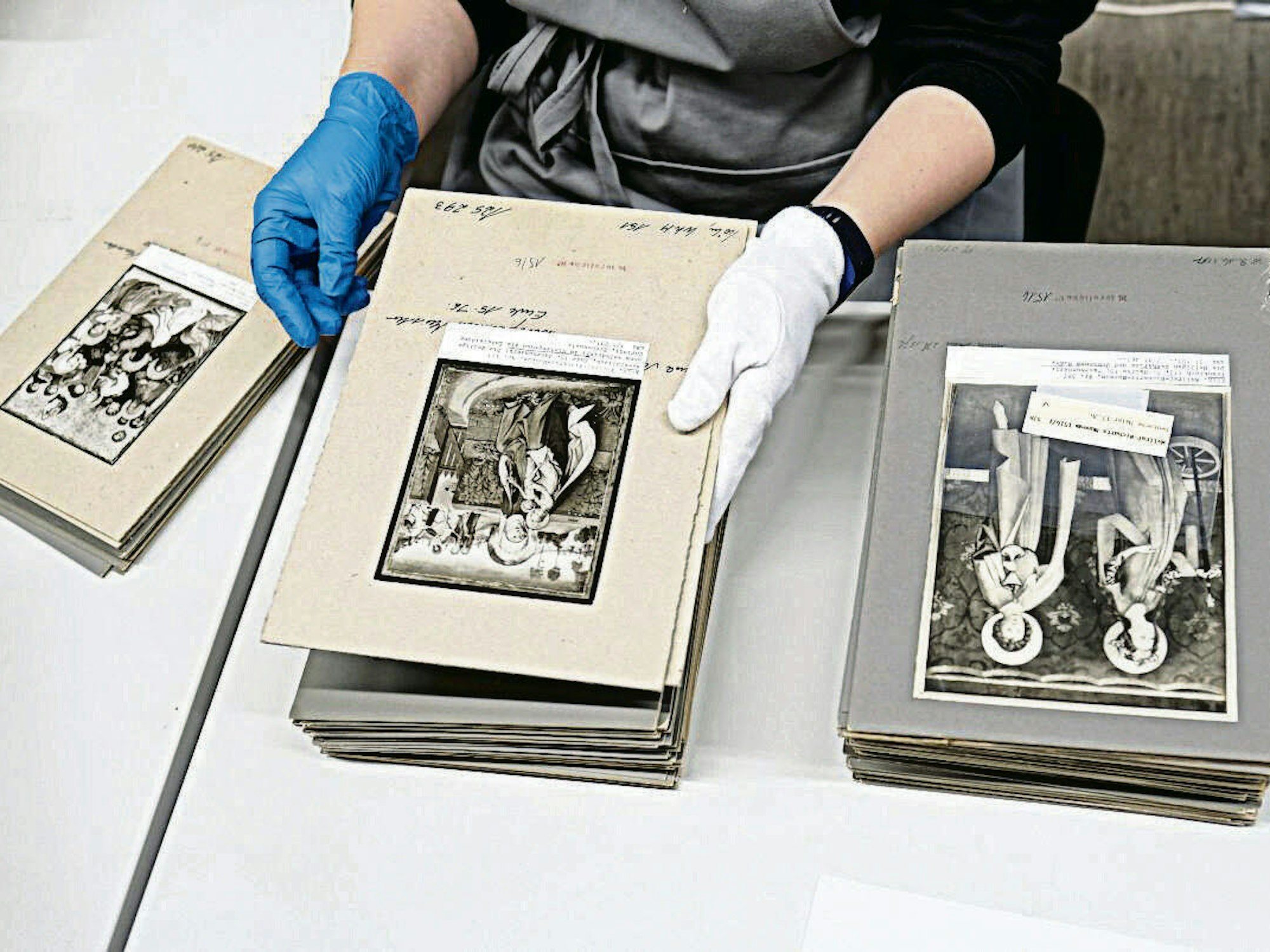 Zurück bleibt der Schmutz aus über 90 Jahren. Am Anfang der Arbeitsstraße steht ein Eimer ehemals weißer Arbeitshandschuhe, spätestens nach drei Tagen ist er bis an den Rand gefüllt. Außer Staub begegnen den Restauratoren auch andere „Schädlinge“, etwa ausgeblutete Tinte (viele Bildträger tragen neben Bleistiftnotizen auch Stempelabdrücke), und selbst Schimmel kommt manchmal vor. In Archivräumen müssen Temperatur und Luftfeuchtigkeit streng überwacht werden, bereits nasse Mäntel am Garderobenständer bringen das Raumklima aus dem Gleichgewicht. „Hier wird nur nebelfeucht gewischt“, so die Restauratorin Eva Boer.