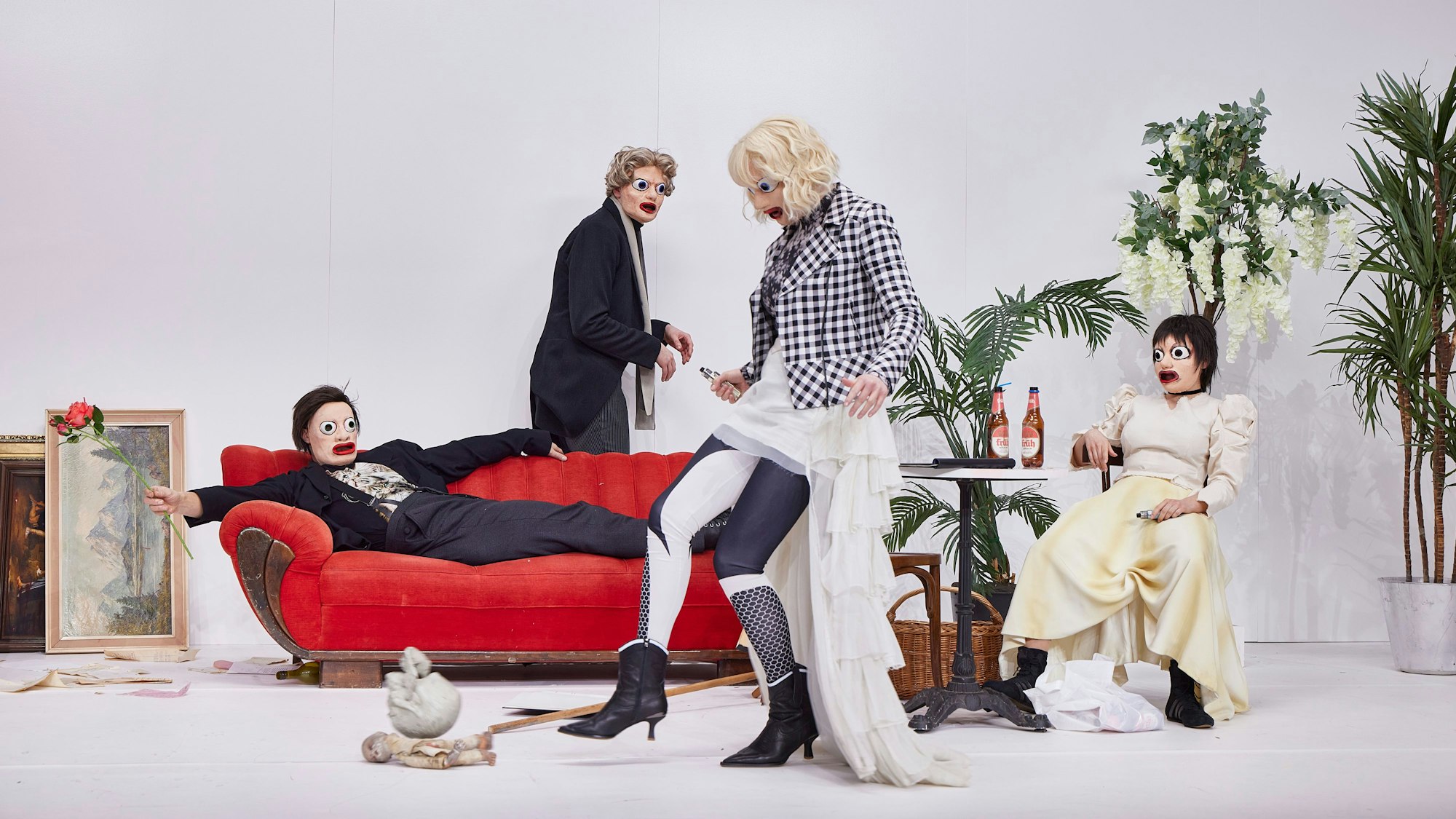 Fast drei Stunden lang (Pause inklusive) hält Öhrn, der Video- und Performancekünstler, diesen oft in Gelächter ausschlagenden Camp-Faktor in der Schwebe. An äußerer Handlung geschieht so gut wie nichts, doch den Maskierten beim in dicke Anführungszeichen gesetzten Geschlechterkampf zuzuschauen, ist ein Vergnügen. Wie sich Andreas Grötzinger als serviler Akteur zwischen Chaiselongue und Topfpflanze windet, wie Bettina Lieder als Siri von Essen Strindberg und Rebekka Biener als ihre Geliebte Marie Caroline David den Dramentext des Dichters an Kölschflaschen saugend mit kichernder Unverschämtheit unterlaufen, wie schließlich Eilinghoff als gemarterter Frauenfeind eine Viertelstunde lang über die korrekte Formel doziert, mit der sich der Umfang seines Penis berechnen lässt, und dabei die langen Glieder in Karl-Valentin-Manier verdreht – man könnte ihnen Stunden zuschauen. Und ist freilich froh, als sich das stotternde Kammerspiel hinter verschlossenem Vorhang im Gewaltexzess entlädt.