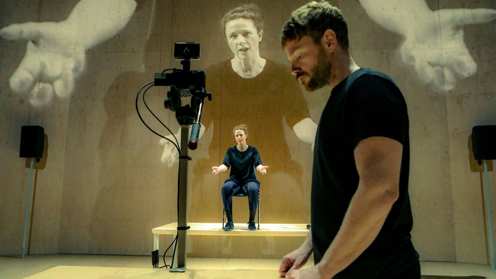 Emmanuel Carrère gilt als Meister autofiktionalen Erzählens, er lässt Lesende die Welt durch seine Augen, mit seinen Urteilen wahrnehmen. In der Kölner Adaption der unter dem Titel „V13“ erschienenen Gerichtsreportage fehlt seine Stimme. Das Publikum füllt die Leerstelle des Autors, findet sich im Videobild auf hölzerner Leinwand inmitten des Geschehens wieder. Statt eines Ich-Erzählers sprechen Claude De Demo und Paul Grill. Sind Richter, Staatsanwälte, Verteidiger, Augenzeugen, Trauernde und Experten, selten Angeklagte – die Übergänge sind fließend, es geht um Intensität, weniger um Klarheit.