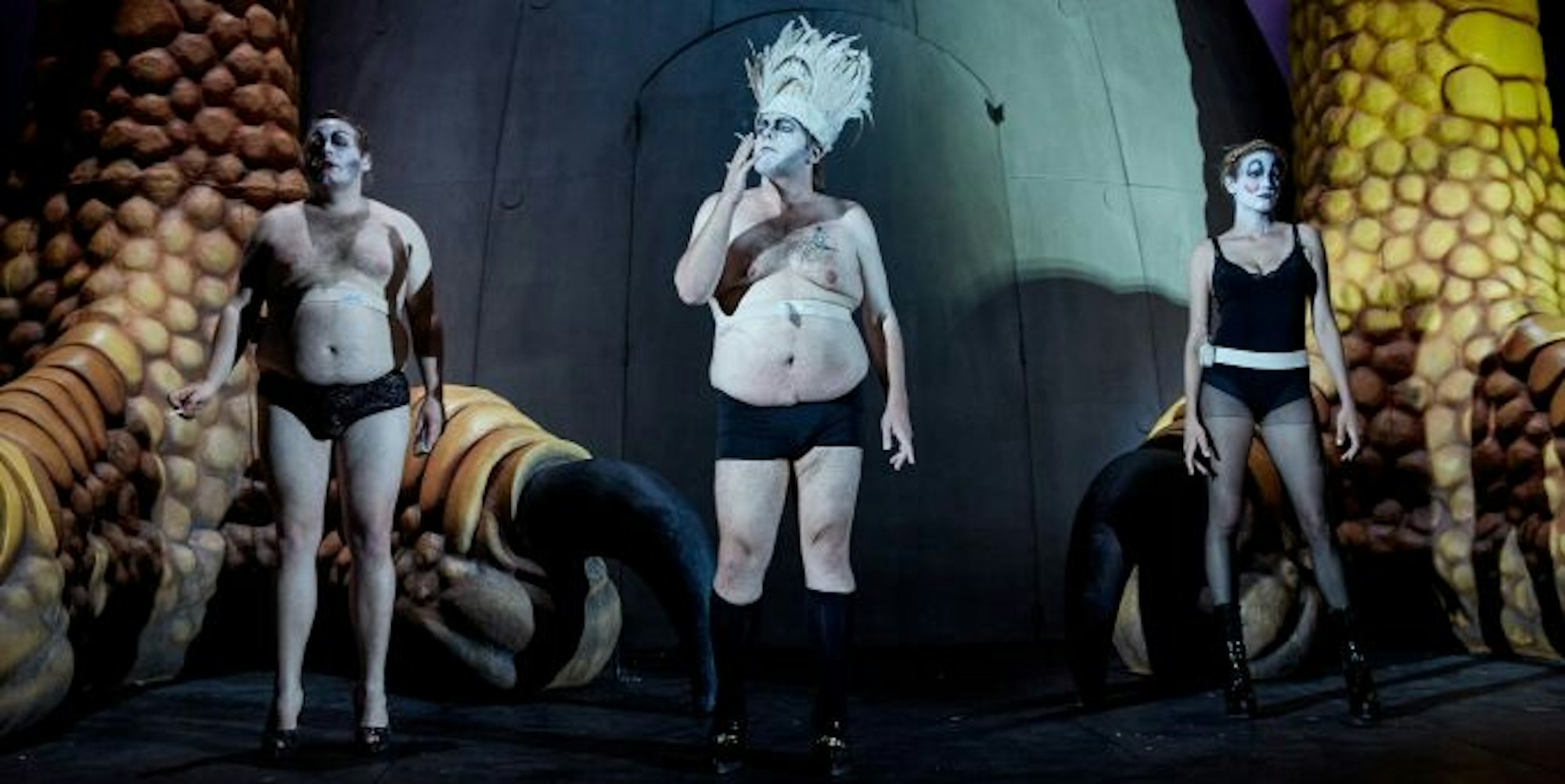 Für „Wut“ hat Mondtag ein riesiges Ei zwischen zwei Adlerbeine gesetzt, in denen der Zuschauer nicht anders erkennen kann, denn als Minarette, mit dem halben Ei als (Kölner Zentral-)Moschee. Zu Anfang ruft Claessens das Publikum jaulend und plappernd aus einem Fenster des Adlerbein-Turms zum – vermutlich lästerlichen – Gebet. Es kommt aber nur Margot Gödrös, die sich von zwei Bühnenarbeitern in einer Sänfte hereintragen lässt. „Singe den Zorn“, ruft sie Claessens zu, „meinen wirst du nicht damit erregen!“ Links und rechts der Vogelbeine hängen hochkant zwei Leinwände, auf denen sich die Schauspieler in Form kitschiger Terrorikonen präsentieren, als hielte David LaChapelle Fotoshootings für den Islamischen Staat ab.