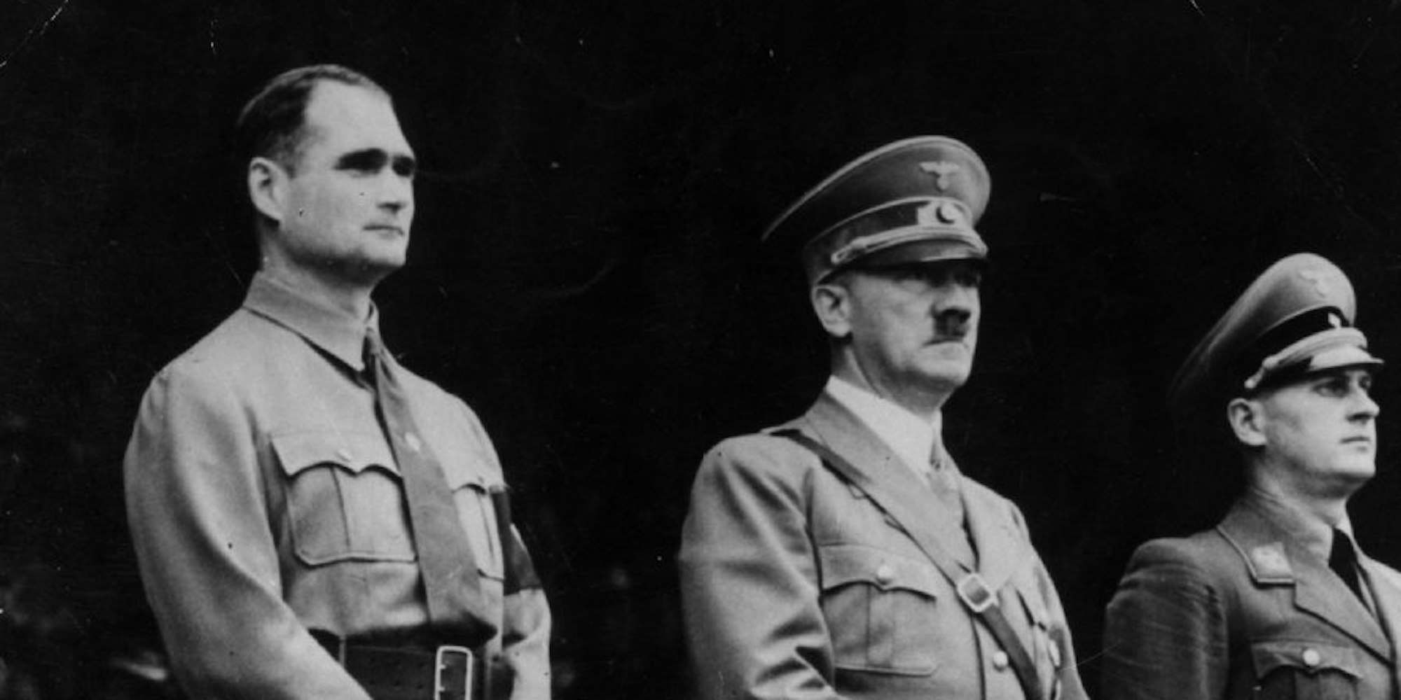 Adolf Hitler (m., 1889 - 1945) mit Rudolf Hess (l., 1894 - 1987) und Baldur von Schirach (1907 - 1974)