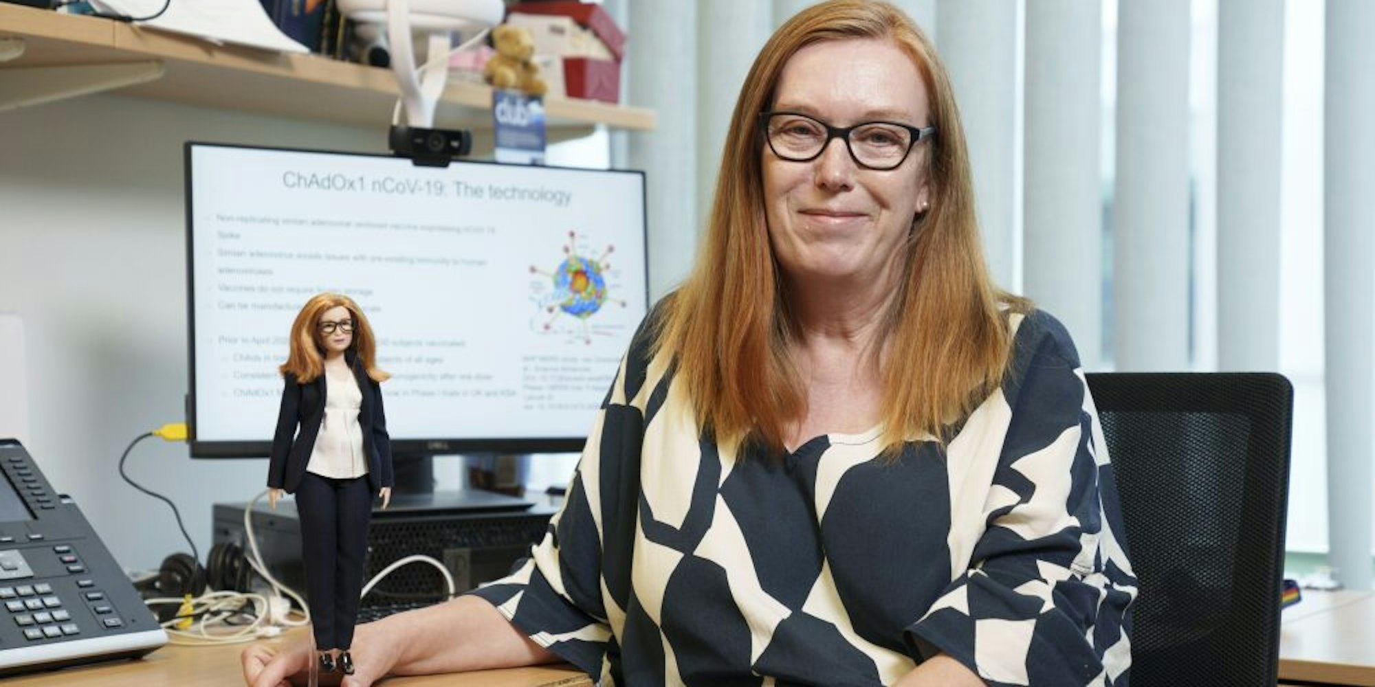 Sarah Gilbert an ihrem Schreibtisch in Oxford mit ihrer Barbie