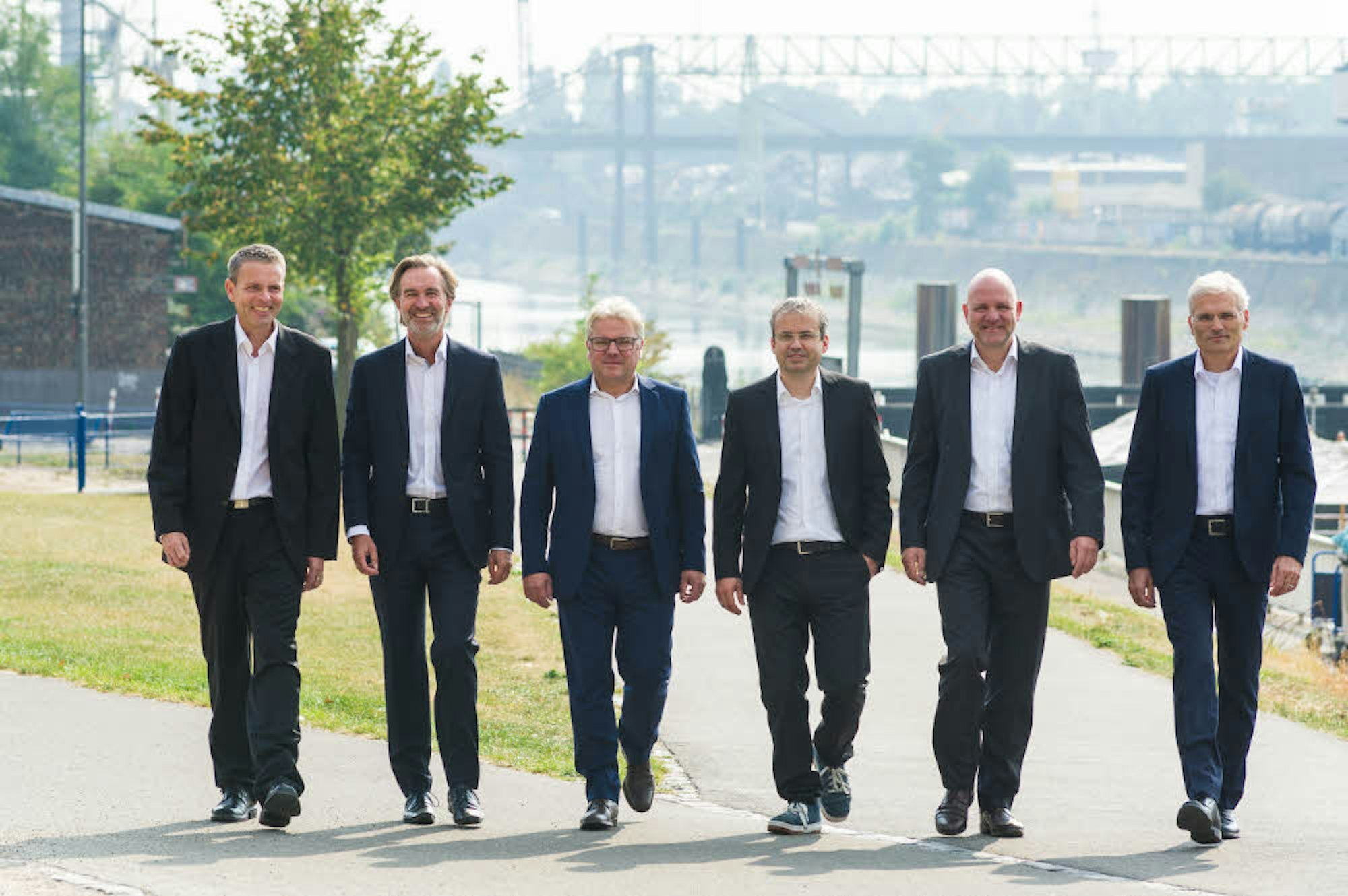 Die sechs Gesellschafter von Astoc Architects and Planners mit Jörg Ziolkowski (2. von links) und Peter Berner (3. von links)