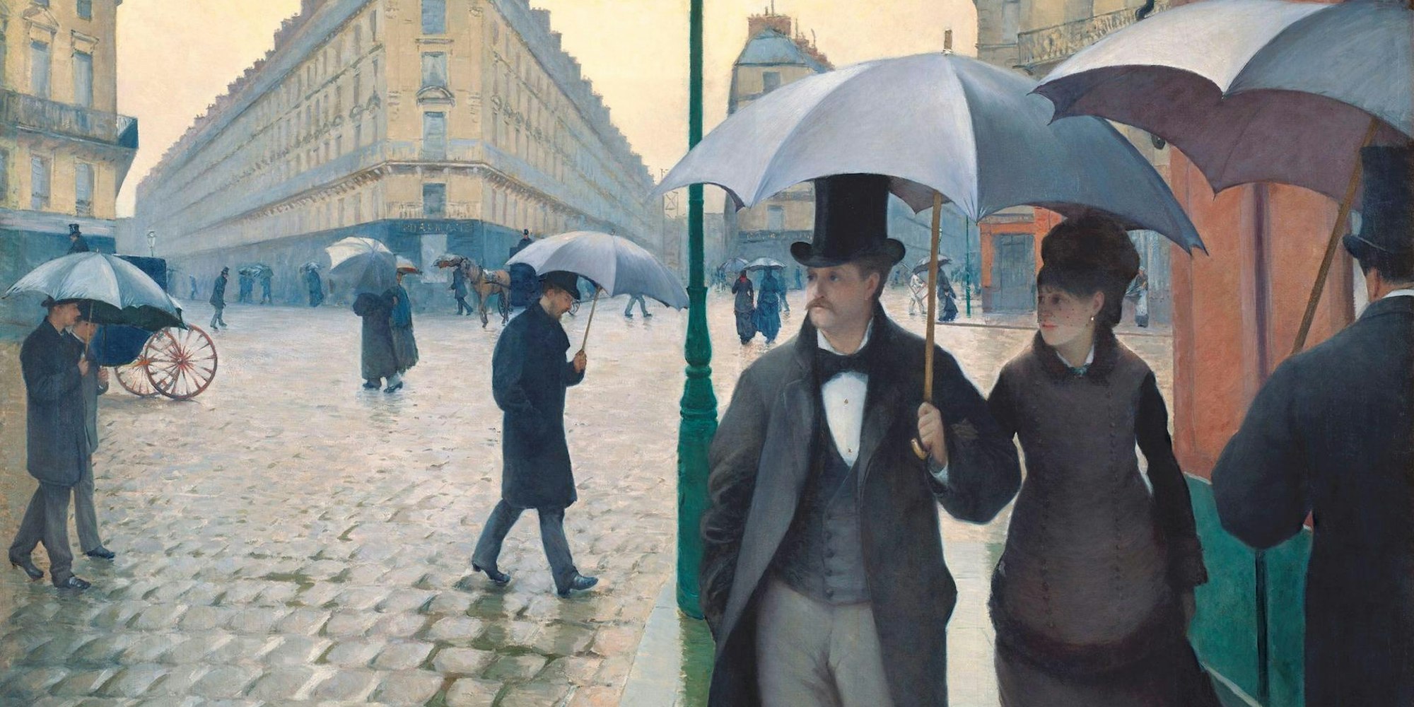 Auch dieses Unbehagen finden wir in Caillebottes Gemälde wieder: Keiner seiner Passanten lächelt, der Mann in der Mitte hält seinen Kopf gesenkt, das Paar rechts hat die Gesichter vom Entgegenkommenden abgewandt. Ihre Regenschirme scheinen die hier Vorübergehenden nicht weniger effektiv von ihren Mitmenschen zu isolieren als die Schutzmasken uns.