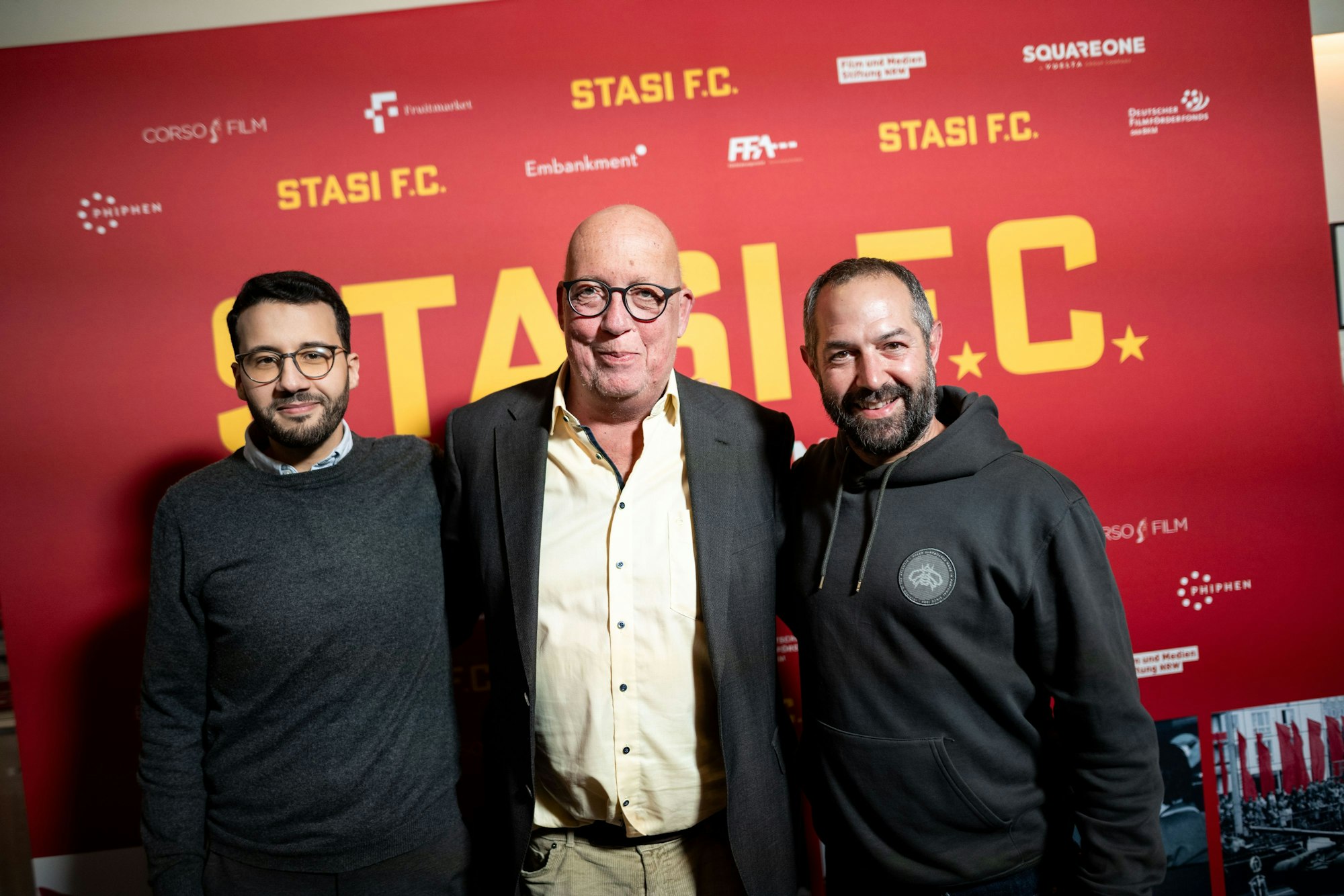 Zakaria Rahmani, Anre Birkenstock und Dan Gordon (v.l.n.r.) bei der Premiere von „Stasi FC “im Odeon Kino in Köln