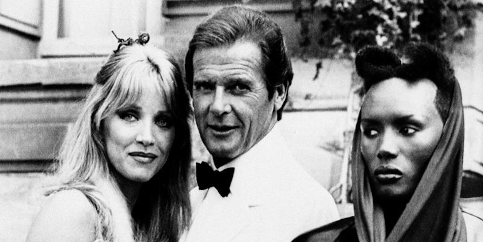 Der britische Schauspieler Roger Moore mit seiner Kollegin Tanya Roberts (l) am „James Bond 007 - Im Angesicht des Todes”-Filmset (1984).