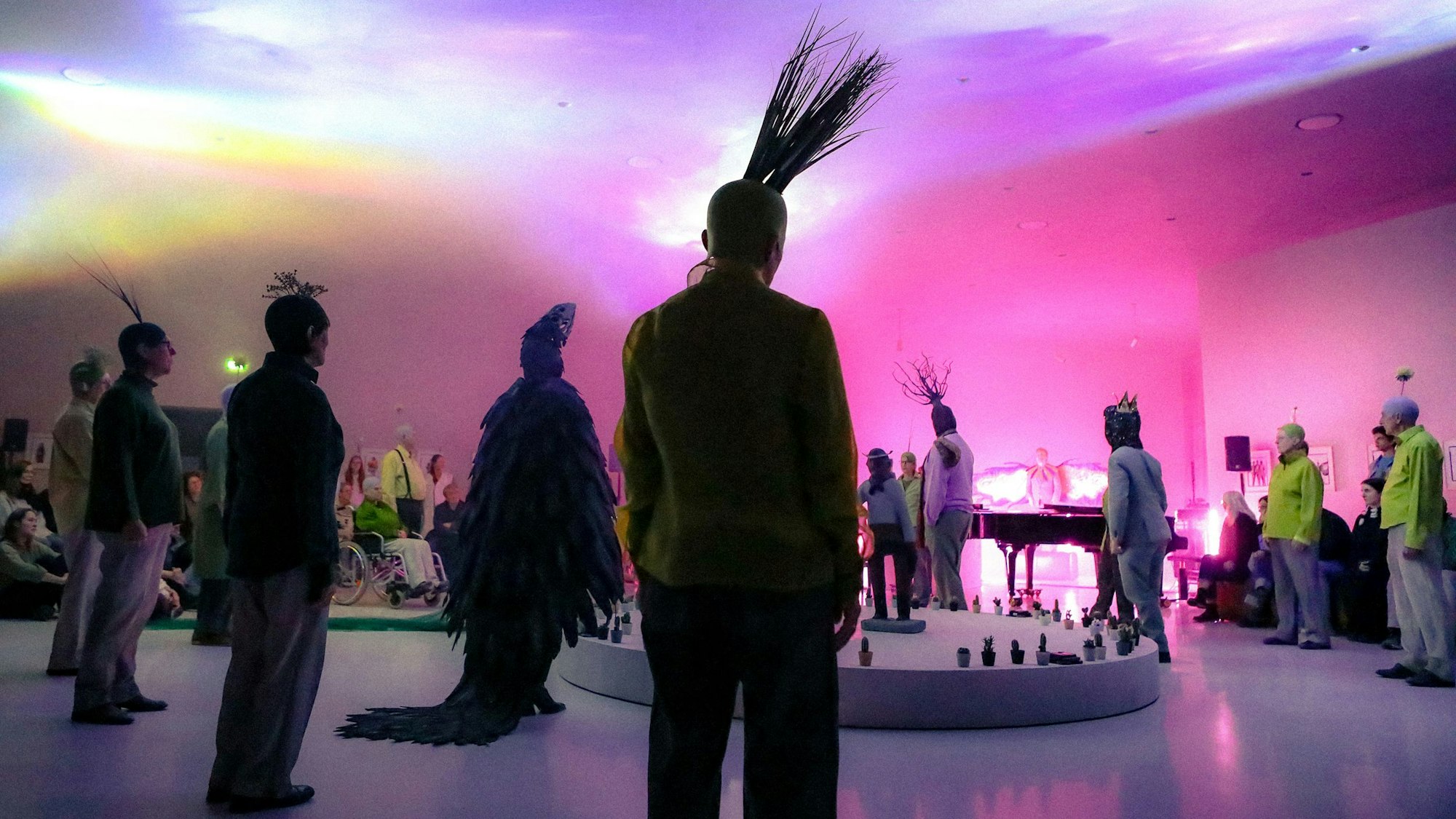 Praktischerweise ruckelte der Rundgang an einigen Stellen gewaltig, lösten sich eindrückliche Bilder – etwa der im Garten stimmungsvoll angeleuchtete Alte-Stimmen-Chor – mit organisatorischen Widrigkeiten und Leerlauf ab. Typisch Köln, eigentlich. Im Foyer wird das Publikum in drei Gruppen aufgeteilt und erlebt je nach Gruppe einen unterschiedlichen Vortrag über innere Sicherheit, gerechte Stadtentwicklung oder die sich selbst im Weg stehende Verwaltung, sodass man sich am Ende unweigerlich fragt, was man wohl Wichtiges verpasst hat. Zuvor müssen aber noch Mäntel und Taschen abgegeben werden, wer will, darf sich einen kleinen Kaktus nehmen, muss den dann aber auch bis zum Schlussbild mit sich herumtragen.