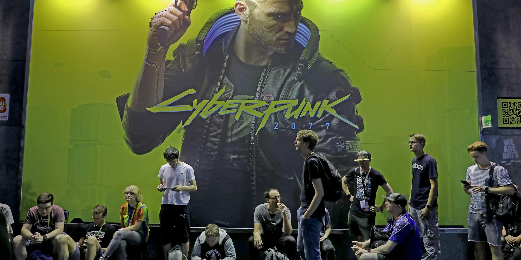 Messebesucher stehen auf der Gamescom für das Computerspiel „Cyberpunk“ an.