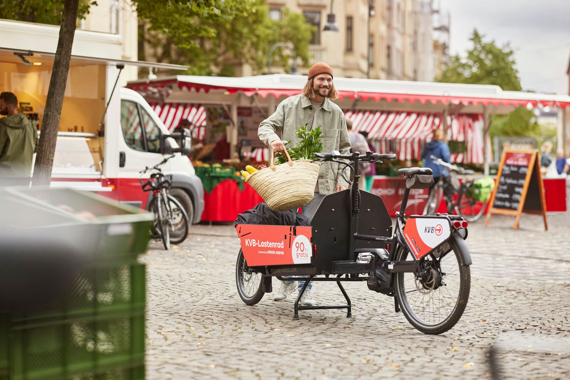 Ein KVB-Lastenrad im Einsatz im Kölner Stadtgebiet.