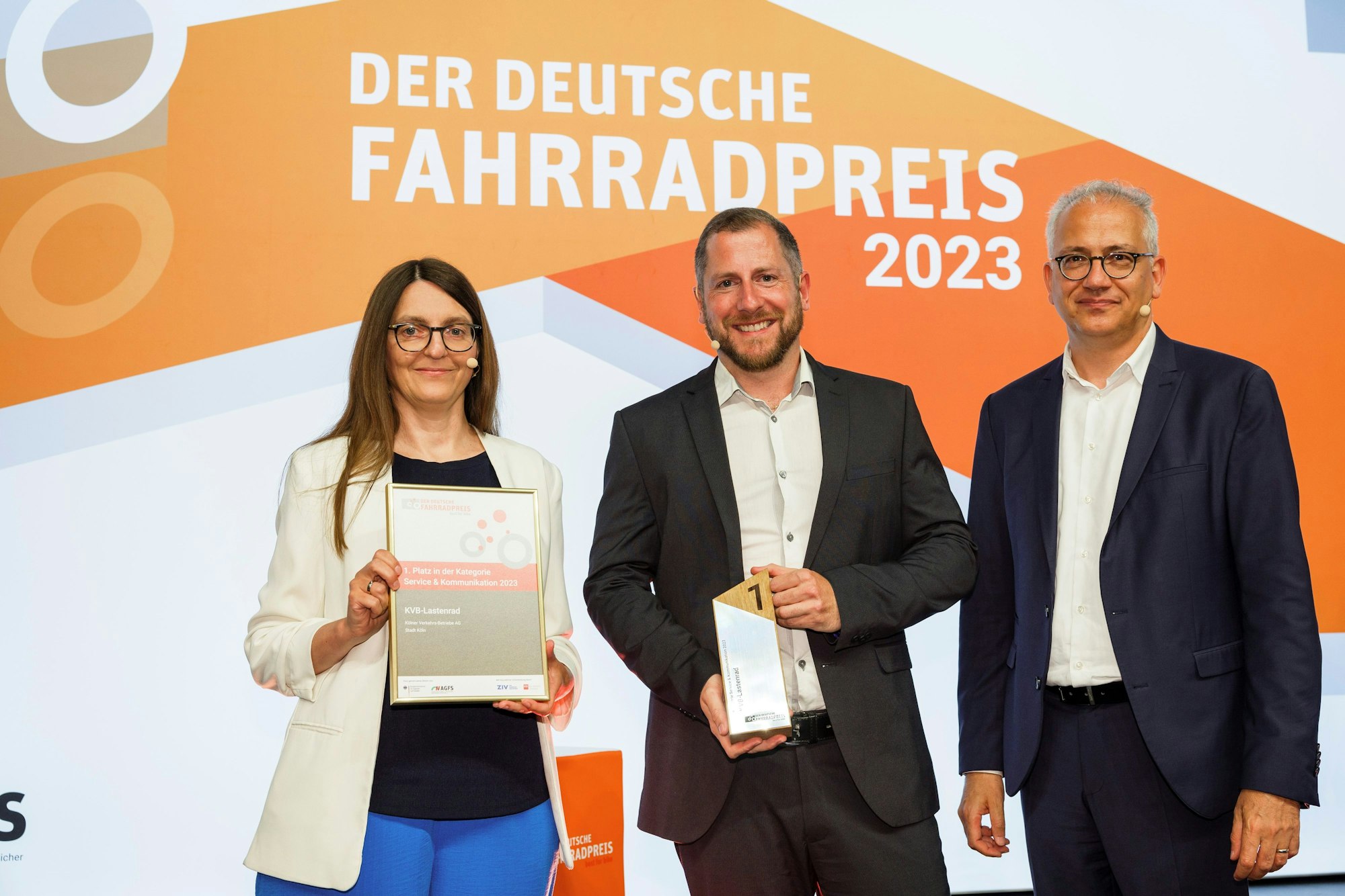 Anke Erpenbeck (Marketingleiterin KVB) und Thomas Bischof (M., Mobilitätsmanager KVB) nehmen den Deutschen Fahrradpreis von Laudator Tarek Al-Wazir (Minister für Wirtschaft, Energie, Verkehr und Wohnen des Landes Hessen) entgegen.