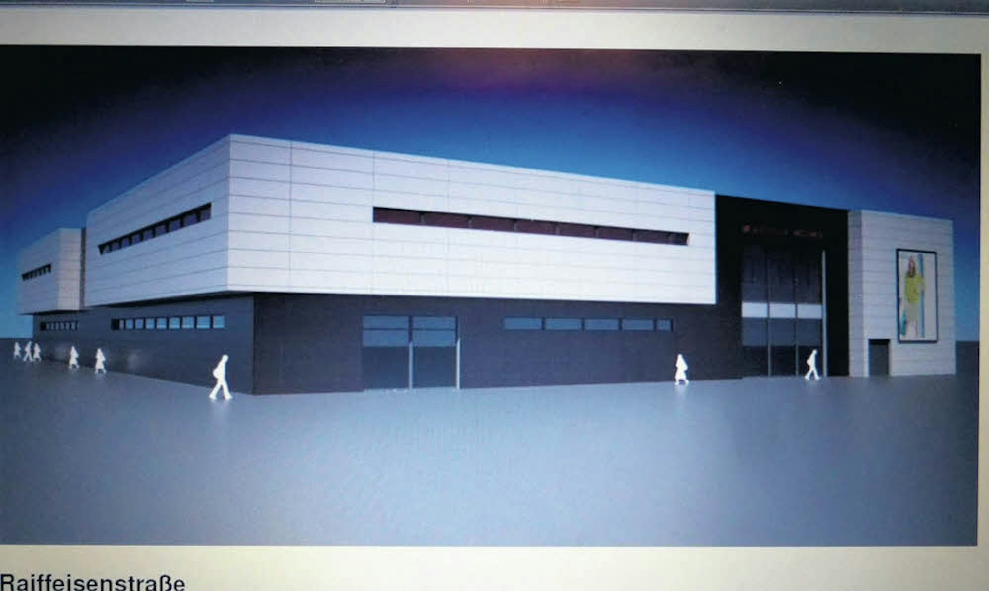 So sieht der Modepark Röther von der Raiffeisenstraße auf der Skizze aus. Der graue Fassadenteil soll nach Lohmarer Wunsch rot gestaltet werden.