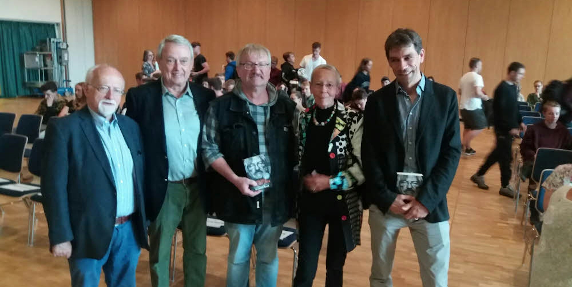 Richard Brox (Mitte) diskutierte mit (v.l.) Bernhard von Grünberg und Horst Becker über Obdachlosigkeit. Oberstufenschüler hatten die Veranstaltung vorbereitet, die Schulausschussvorsitzende Gabriele Krichbaum half, der Schulleiter Mario Heese (r.) hieß die Gäste willkommen.