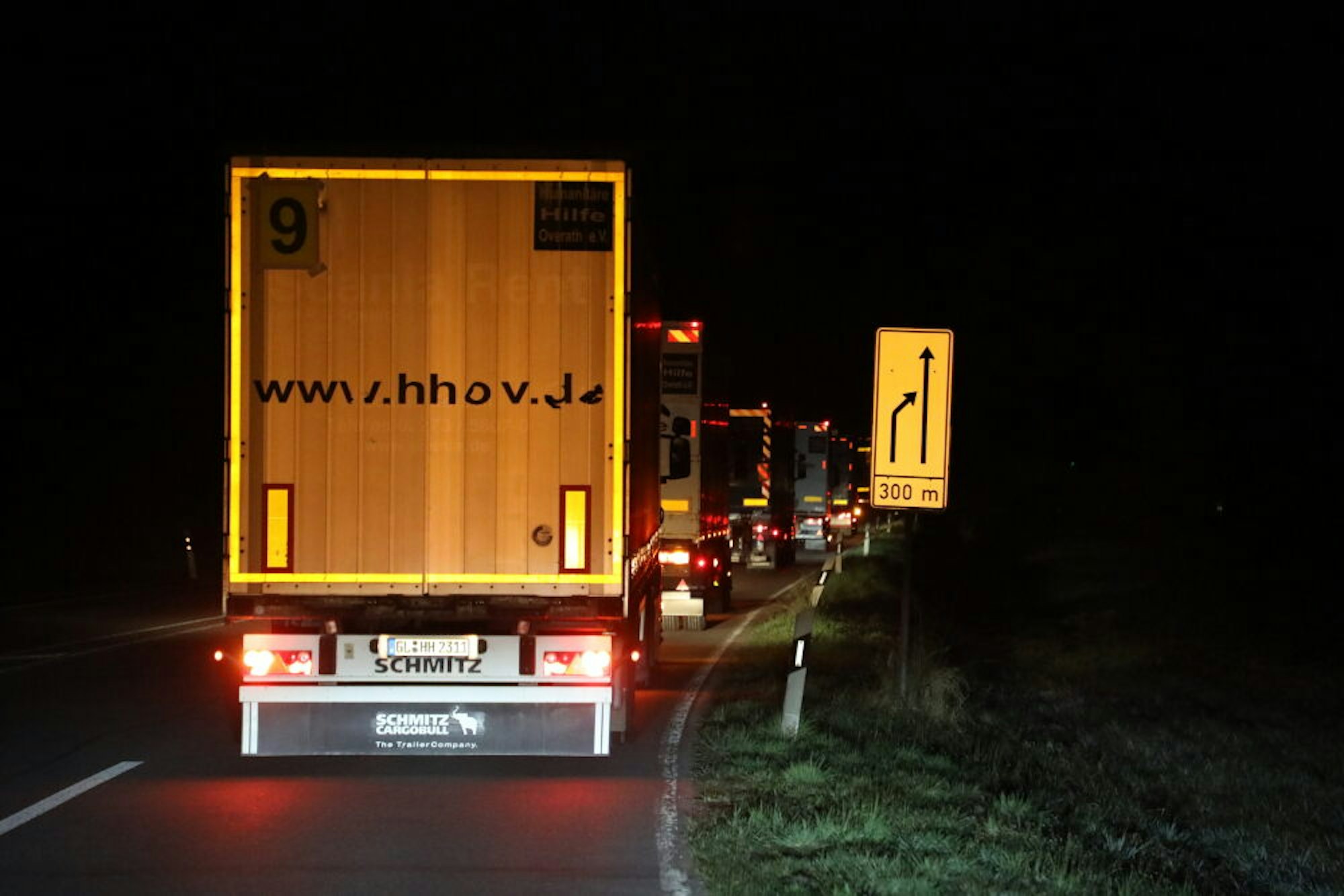 Der Konvoi mit zehn Lkw nach dem Start aus Overath auf dem Weg zur A3.