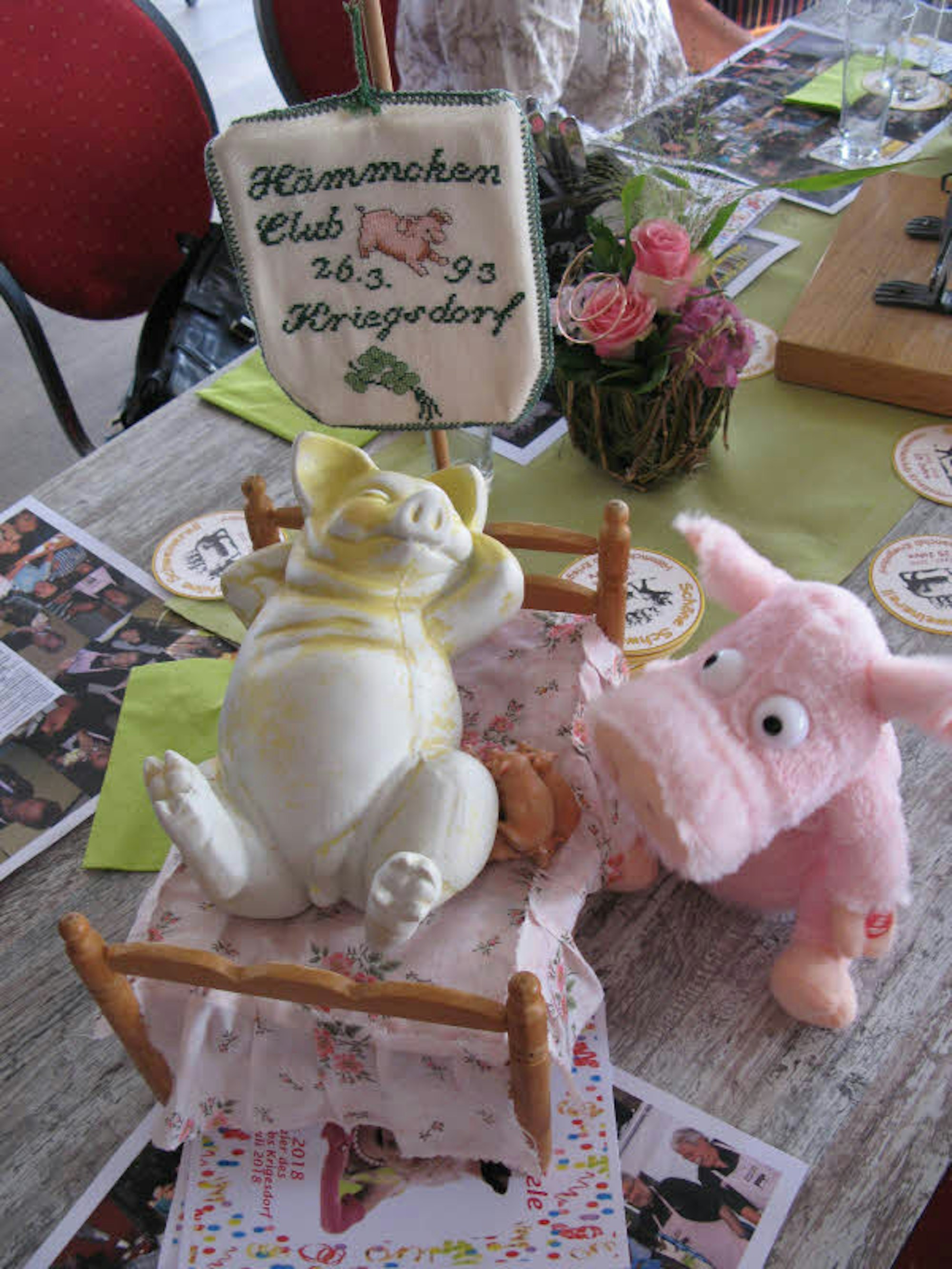 Die rosafarbene Schürze, die sich Albert Ossendorf umbindet, zählt zur Ausstattung der 15 Clubmitglieder. Hämmchen und Beilagen trafen mal wieder genau den Geschmack der Eisbein-Experten. Clubwimpel, Maskottchen Michaela und andere Schweinchen sind immer dabei.