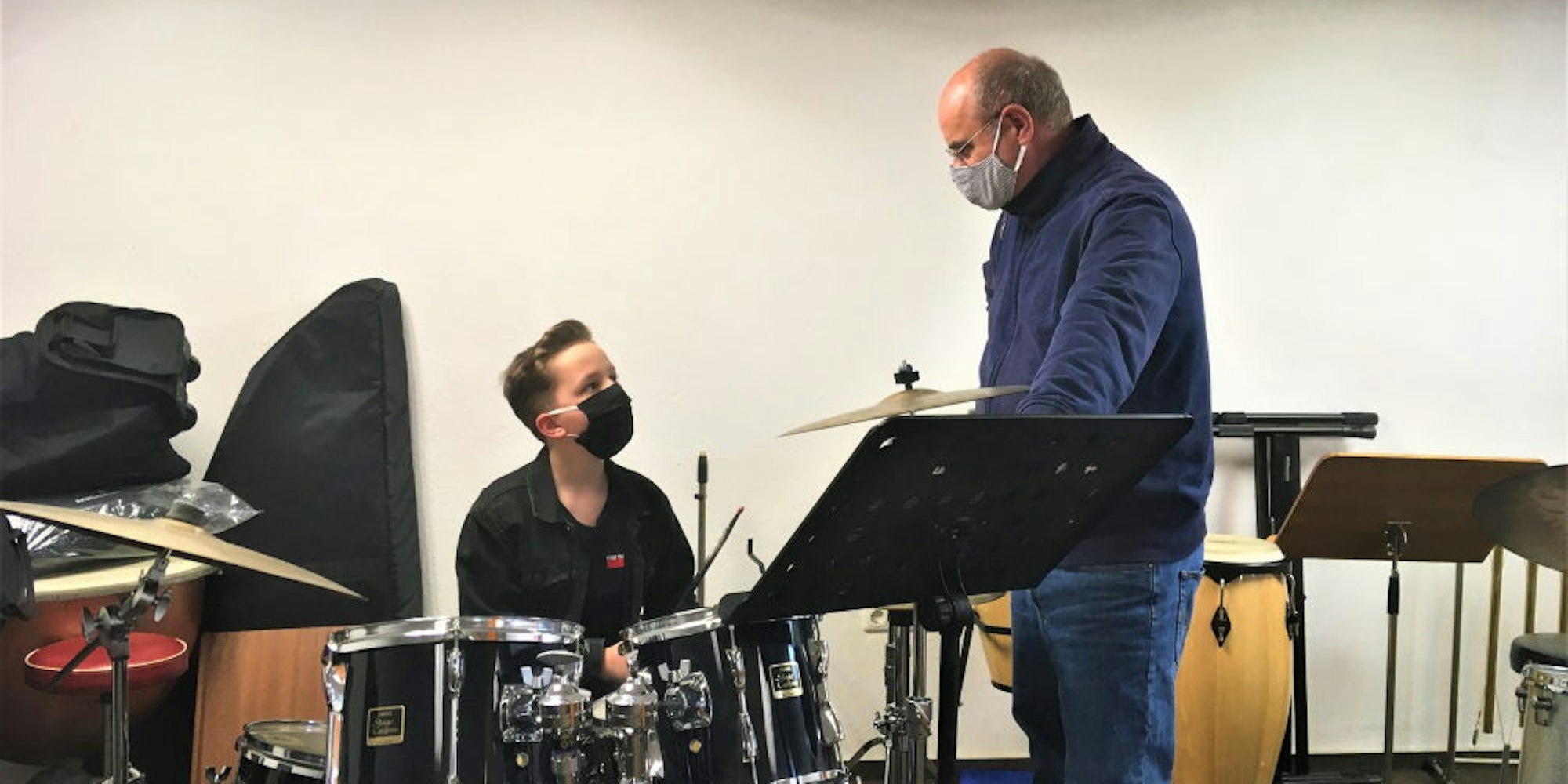 Die Mund- und Nasenschutz-Pflicht gilt auch beim Schlagzeug-Unterricht der Musikschule Erft-Swist mit Leiter Thomas Väth.