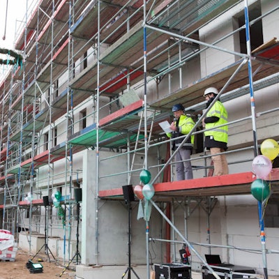 Hier entstehen 18 barrierefreie Doppelhaushälften. Bauträgerin Bonikta van Hoek und Michael Ketzler von der Projektentwicklung Wengerter Massivhaus GmbH hatten die überwiegend jungen Familien zum traditionellen Richtfest eingeladen und informierten die neuen Bewohner über den Stand der Dinge.
