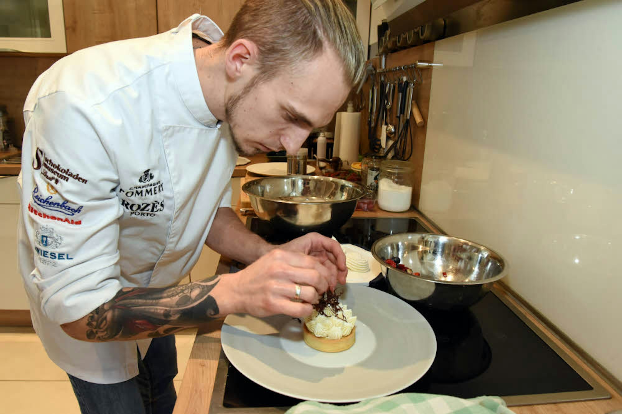 Windeck – Es ist ein wahres Kunstwerk, das Cyril Becker zu Hause in seiner Küche in Windeck auf den Teller zaubert. Konzentriert und mit ruhiger Hand setzt er hauchdünne Schokoladenäste auf die kleine Tartelette, das er zuvor gebacken, mit Früchten gefüllt und mit einer Eishaube aus weißer Schokolade versehen hat.