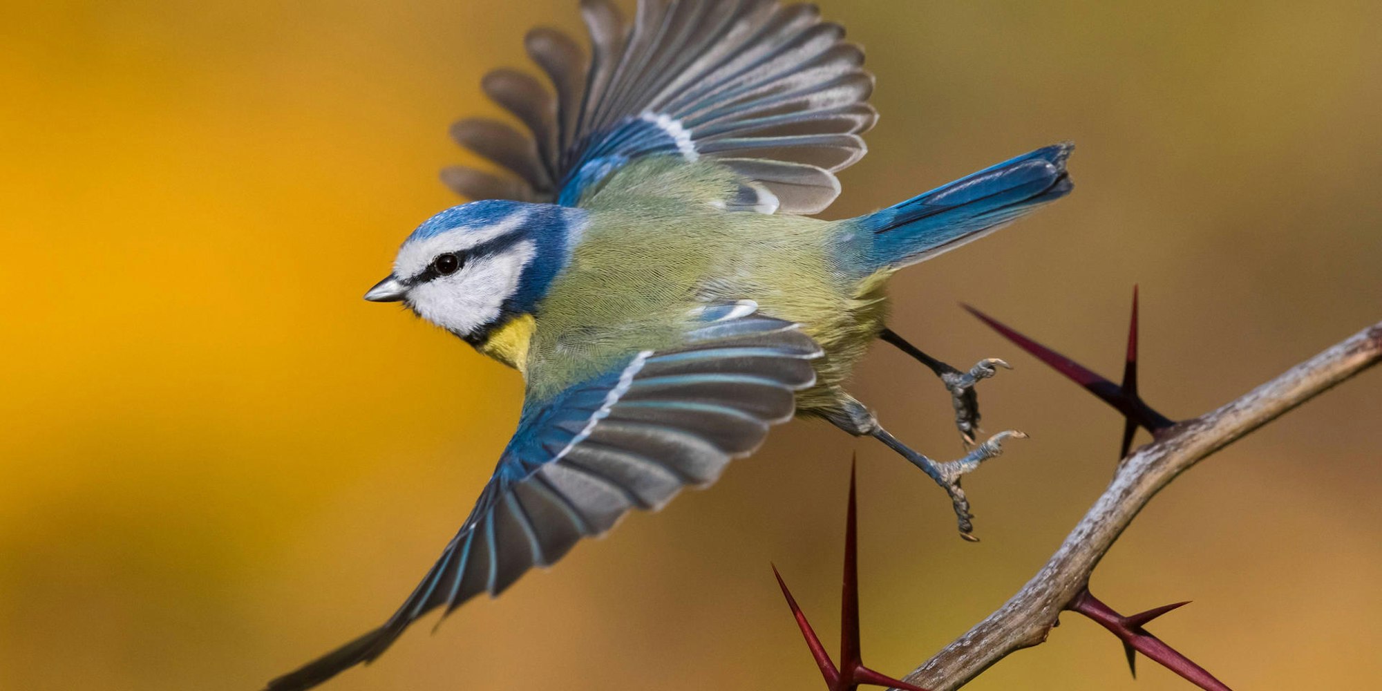 Eine Blaumeise beginnt ihren Flug.
