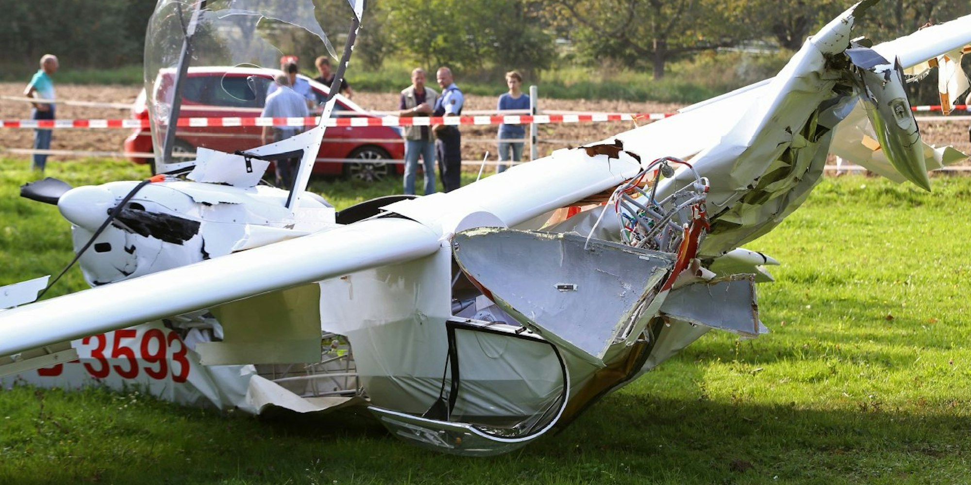 Die ineinander verkeilten Wracks des Motorflugzeuges und des Segelflugzeuges