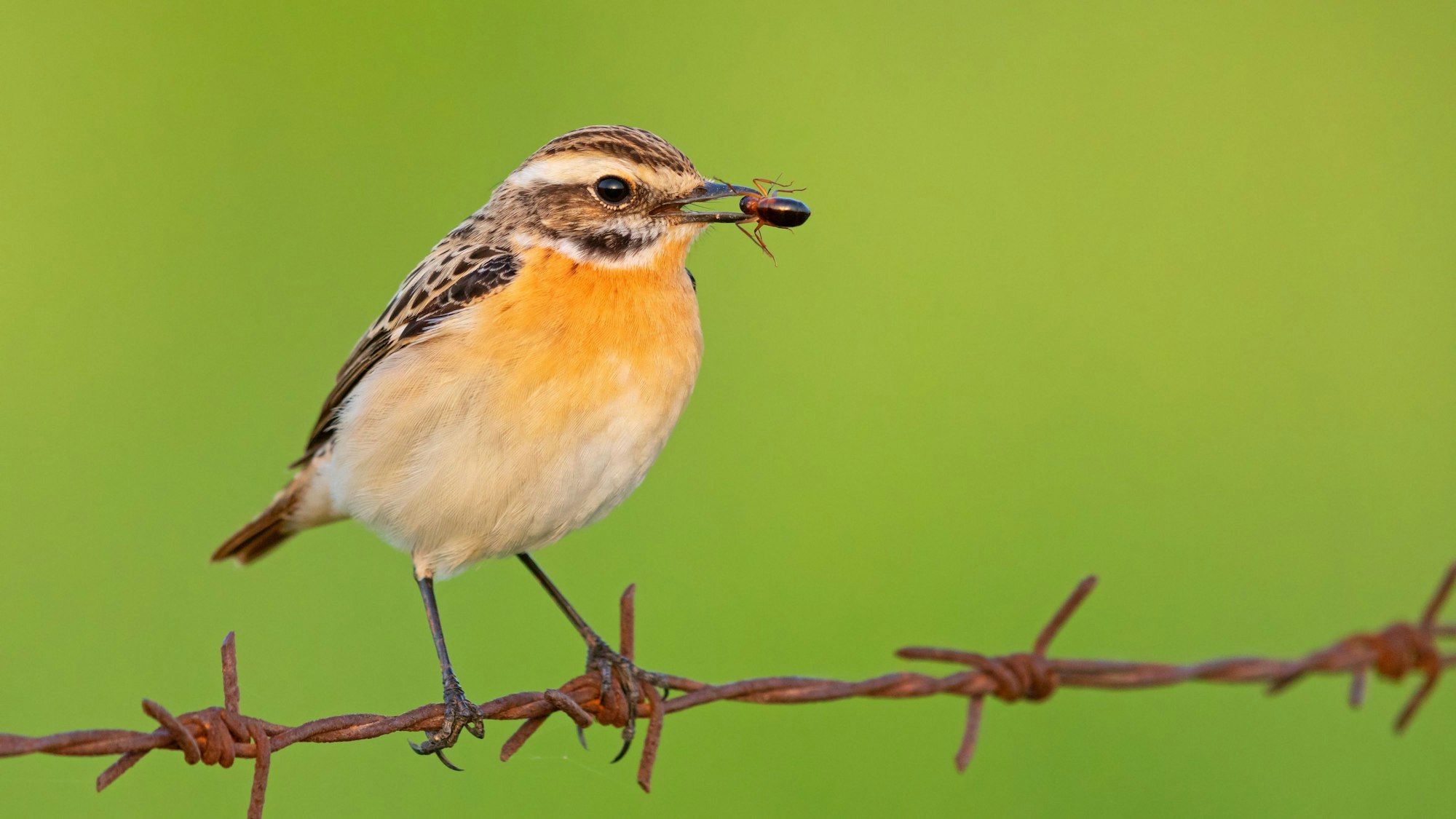 Braunkehlchen sind bis zu 13 Zentimeter große Zugvögel und verbringen den Winter südlich der Sahara im tropischen Afrika. Zur Brut im April treten sie dann einen Rückweg von mehr als 5000 Kilometern an. In NRW angekommen, fühlen sich die Wiesenbrüter besonders in der Nähe von blütenreichen Wiesen und Brachen wohl. Diese Lebensräume werden allerdings immer seltener, weshalb Braunkehlchen in NRW mittlerweile sogar vom Aussterben bedroht sind.