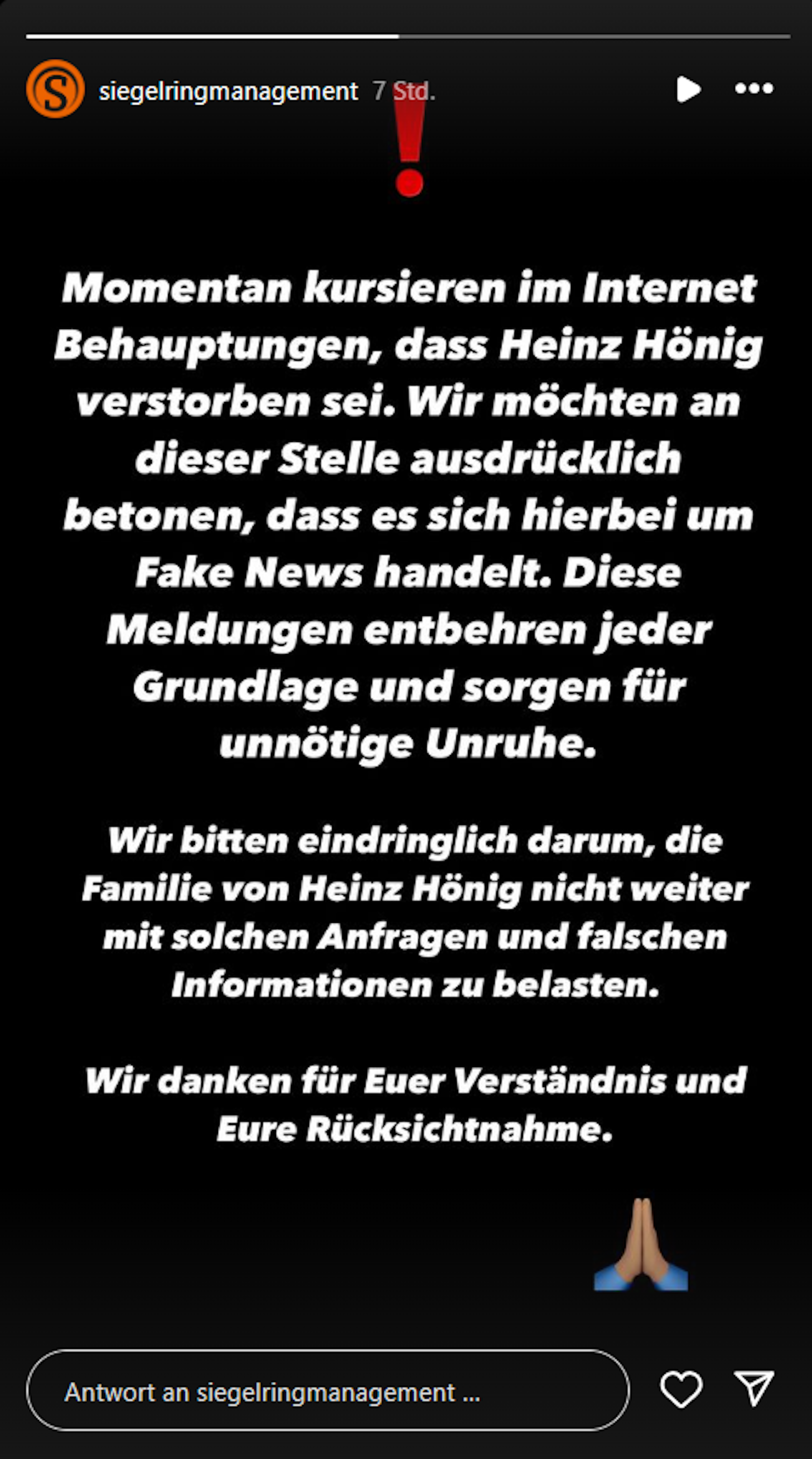 Weiterhin bittet das Management darum, „die Familie von Heinz Hoenig nicht weiter mit solchen Anfragen und falschen Informationen zu belasten“. Die Stellungnahme wurde sowohl auf dem Instagram-Profil von Heinz Hoenig, dem von Annika Kärsten-Hoenig als auch auf dem Profil des Managements veröffentlicht.