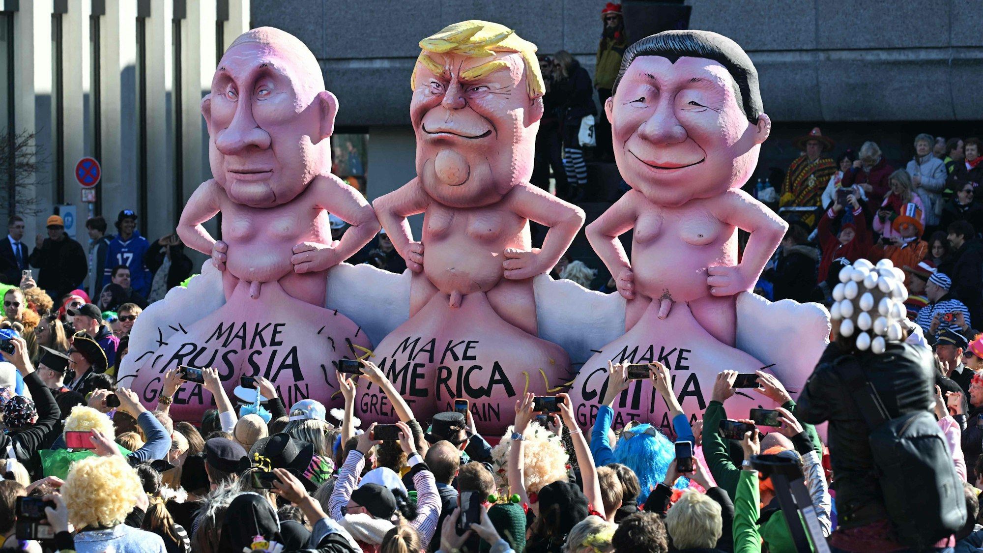 Ein anderer Motivwagen in Düsseldorf zeigte Trump zusammen mit Putin und dem chinesischen Präsidenten Xi Jinping – alle drei stellen hüllenlos „dicke Eier“ zur Schau. „Alle drei Großmächte sind in den Händen von antidemokratischen Despoten – das ist die Botschaft“, so Tilly.