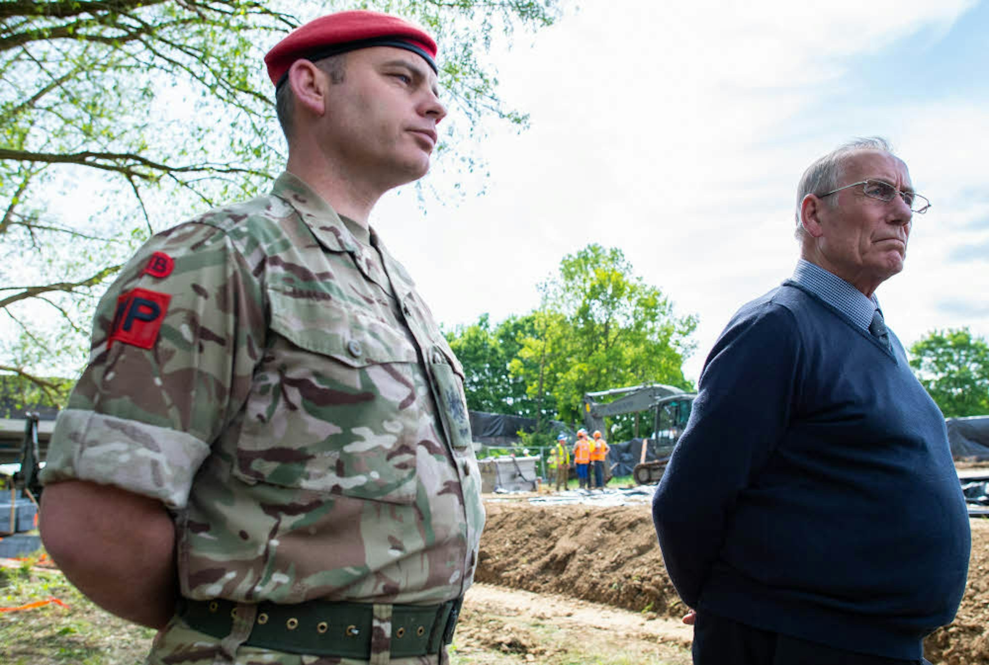 Richard Lee, Vater der seit 36 Jahren vermissten Katrice, beobachtet mit Fahndungsleiter Richard O’Leary (l.) die Arbeiten.