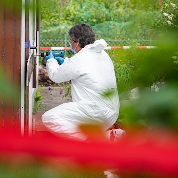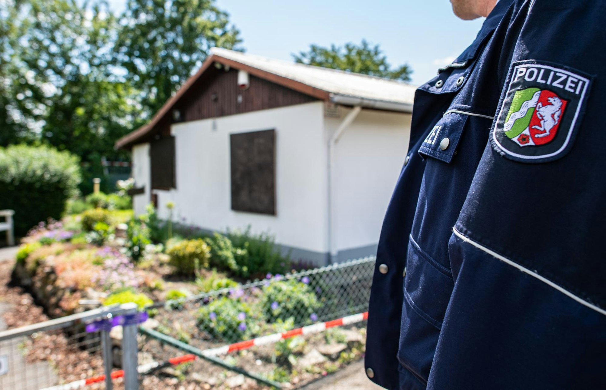 Ein Polizeibeamter vor der Gartenlaube, wo der vermutliche Haupttäter von Münster Teile seiner Server-Anlage unterbrachte.