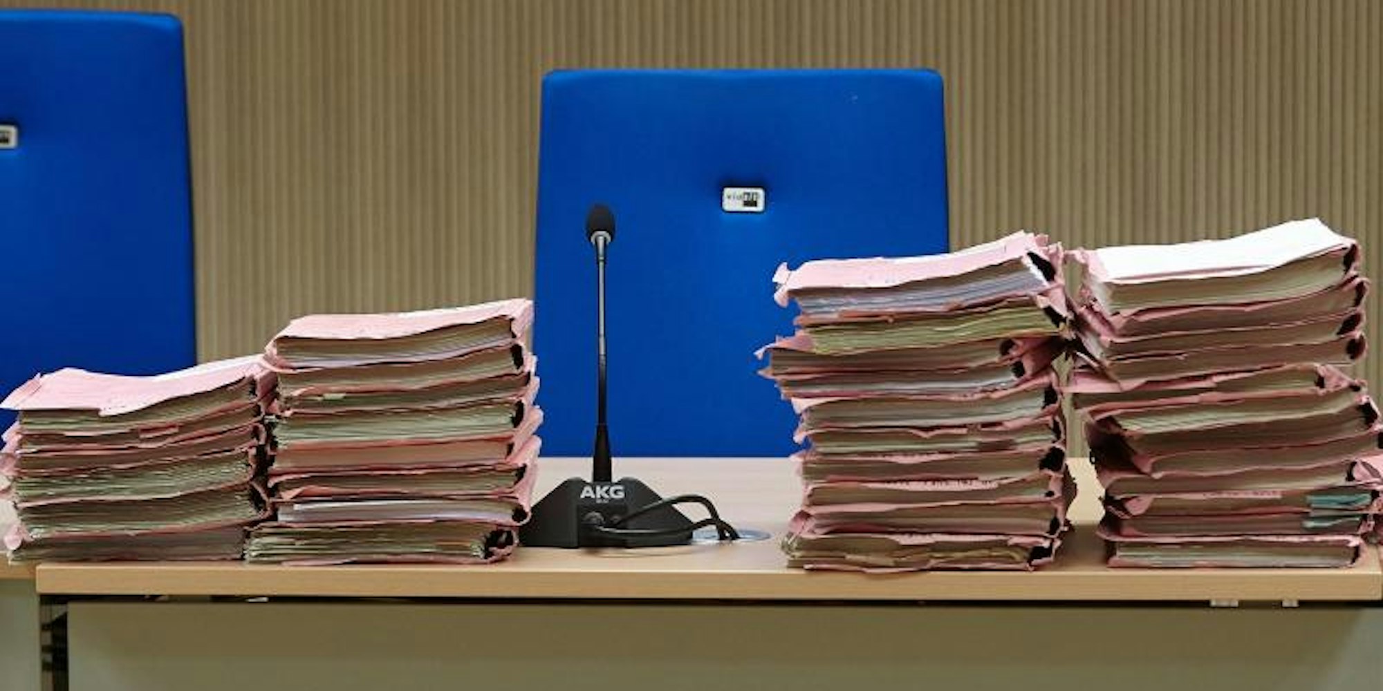 Prozessakten liegen in einem Gerichtssaal. (Symbolbild)
