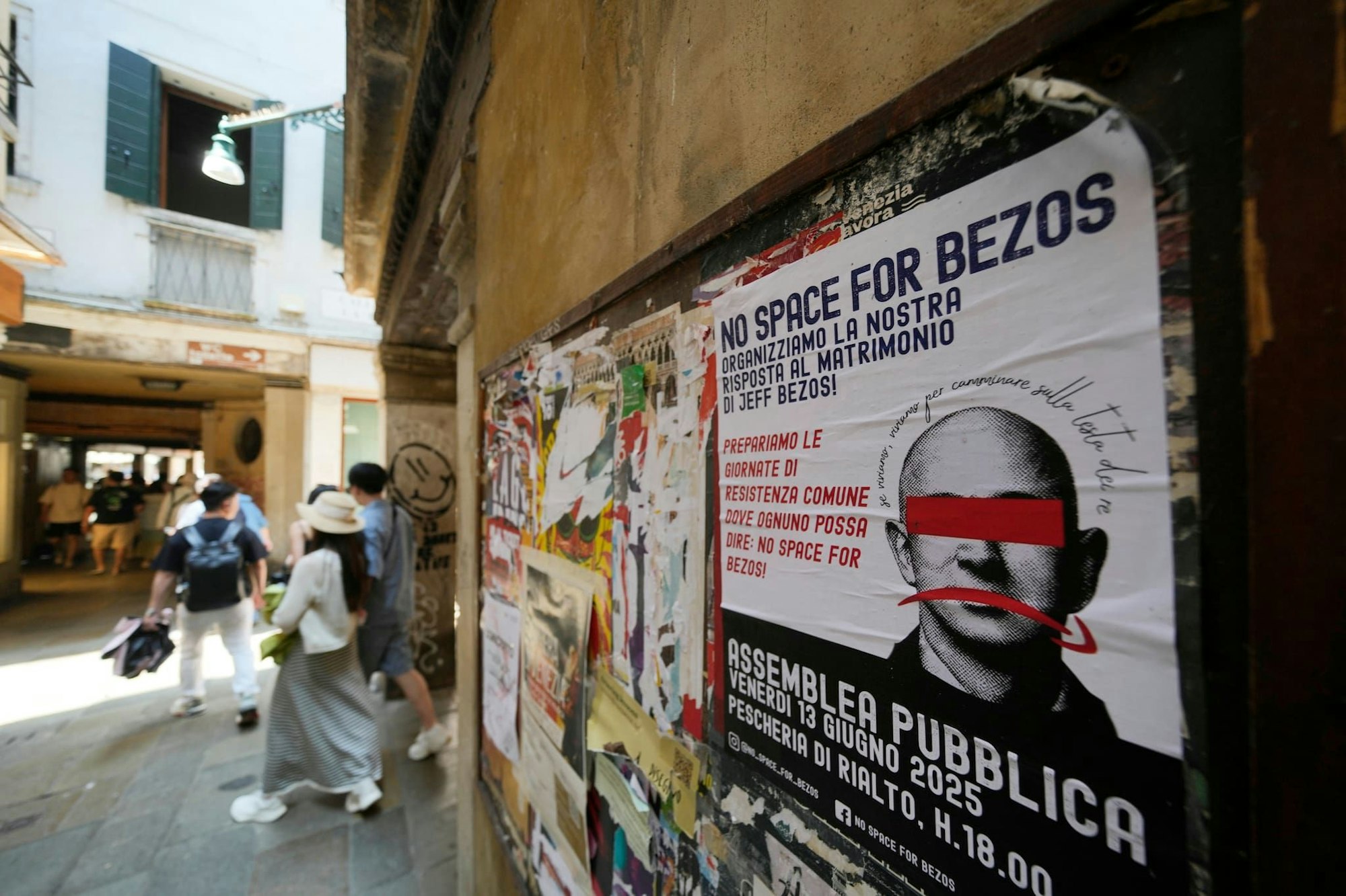 Ein Protestplakat mit der Aufschrift „Keine Hochzeit mit Jeff Bezos“ ist an einer Wand in Venedig angebracht.