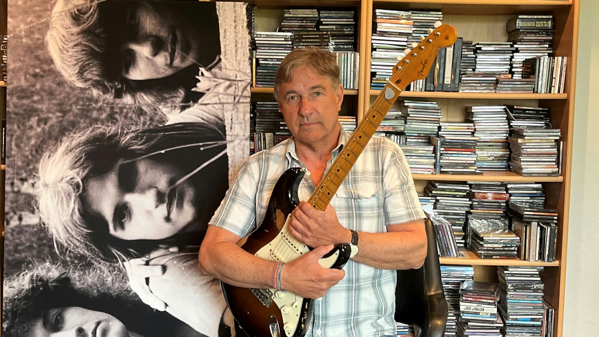 Peter Sommer mit vergrößerter Aufnahme seiner alten Schulband Haymon, in der Hand die Fender Stratocaster von seinen Kollegen.