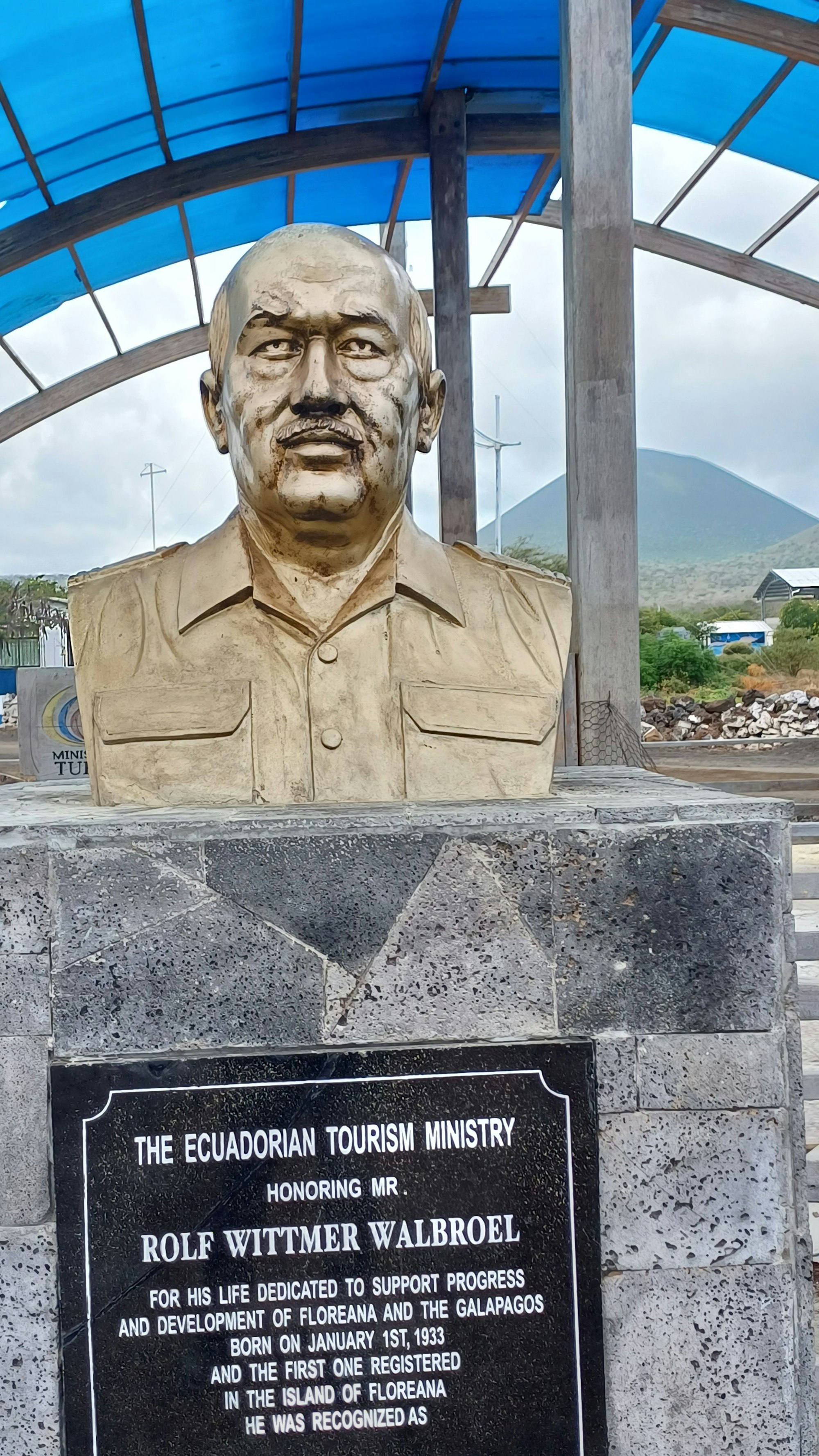 Denkmal für Rolf Wittmer am Pier von Floreana. Der Sohn von Margret und Heinrich Wittmer ist der erste Mensch, der auf der Pazifikinsel geboren wurde.