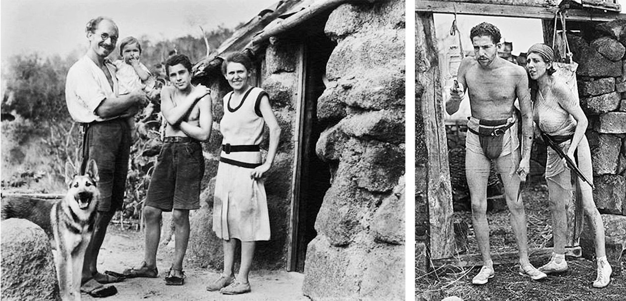 Vor der Katastrophe: Die Kölner Heinrich und Margret Wittmer mit ihren Söhnen Rolf und Harry vor ihrem ersten Steinhaus auf Floreana. Baronin Eloise Wagner de Bousquet (r.) zusammen mit ihrem Liebhaber Robert Philippson bei Dreharbeiten zu einem Piratenfilm