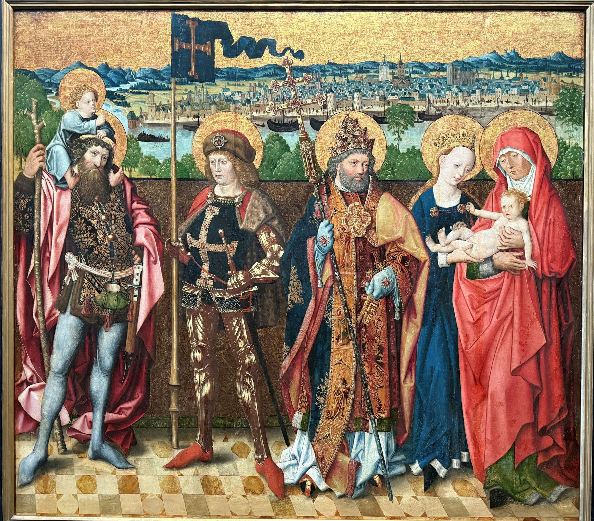 Das Gemälde eines unbekannten Malers aus dem 15. Jahrhundert zeigt den Heiligen Gereon (2.v.l.) vor dem Kölner Stadtpanorama neben den Heiligen Christopherus (l.) und Petrus (r.) sowie Anna und Maria