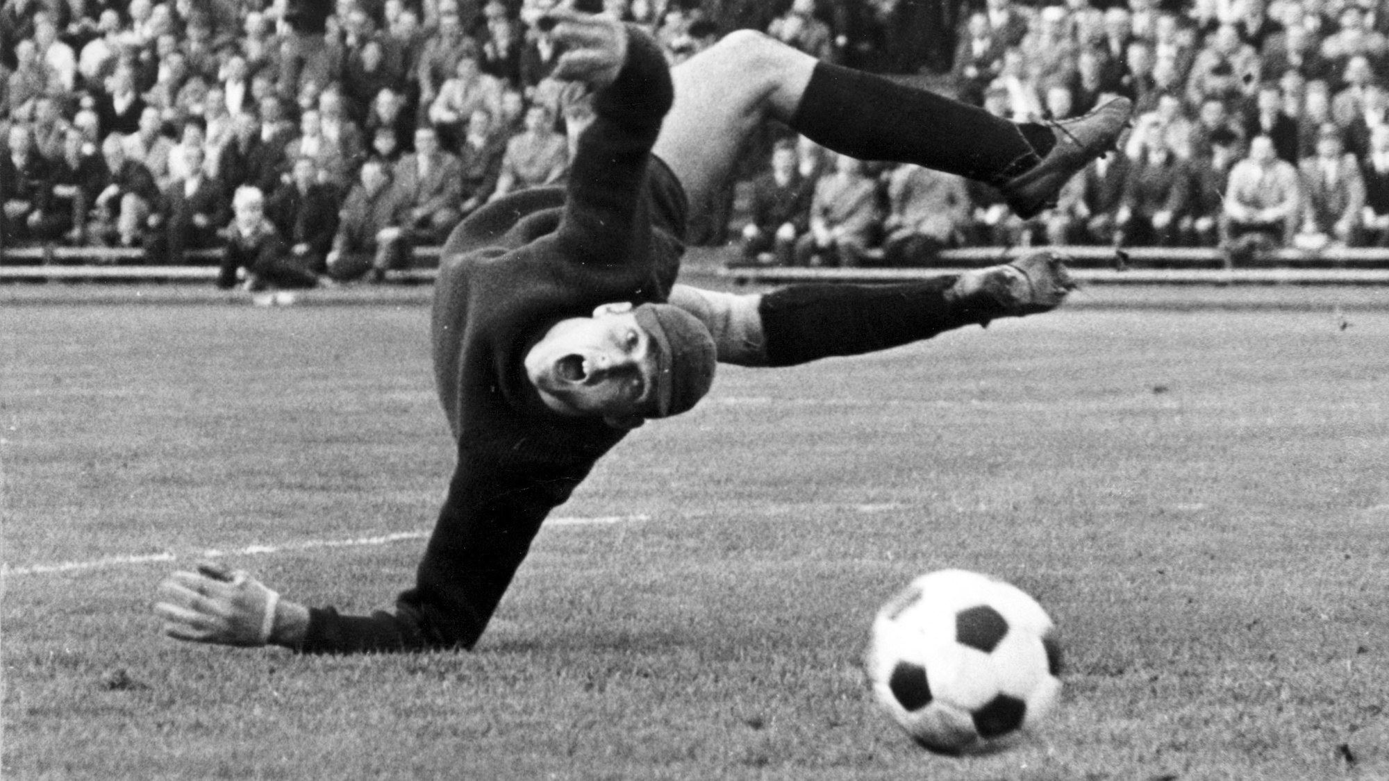 Torwart Manfred Manglitz schaut dem Ball hinterher. 1969 wechselte er von Duisburg zum 1.FC Köln. Zwei Jahre später war er eine der Hauptpersonen im Bundesligaskandal.