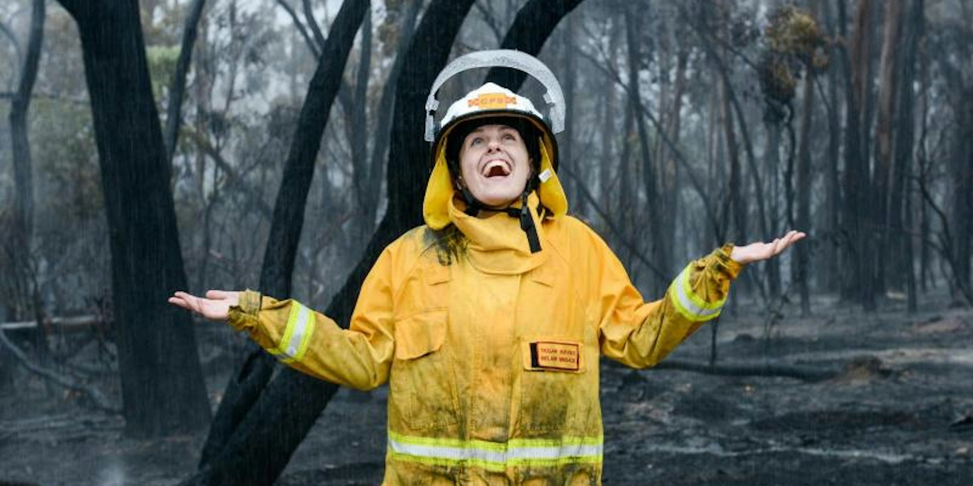Feuerwehrfrau Tegan Rayner von der Belair Brigade CFS freut sich über den Regen, nach den Löscharbeiten der Buschbrände.