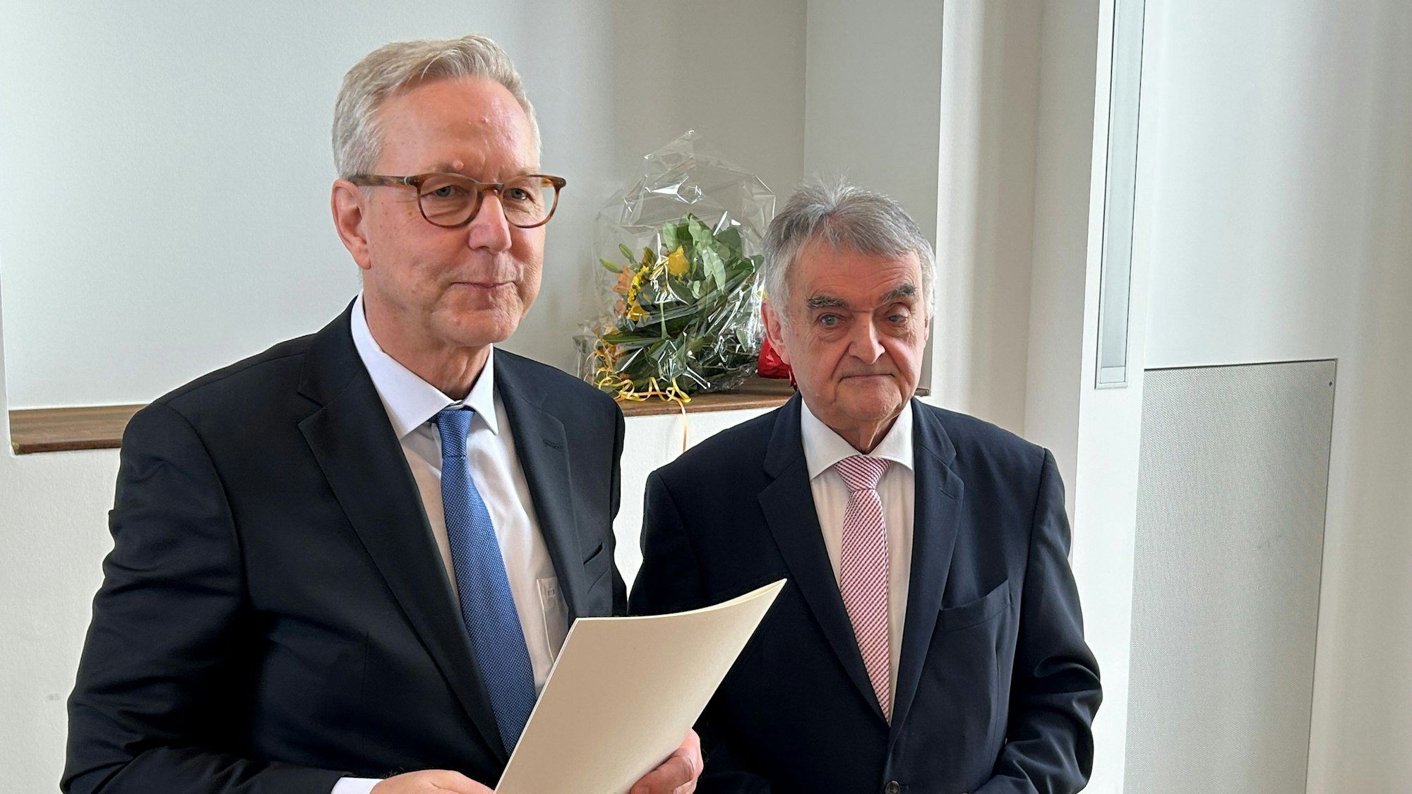 Gregor Lange (links) bei der Ernennung zum neuen Kölner Regierungspräsidenten durch NRW-Innenminister Herbert Reul (CDU) am Montag, 23. Februar 2026, in der Bezirksregierung Köln. Lange war zuvor zwölf Jahre lang Polizeipräsident in Dortmund. Foto: Peter Berger