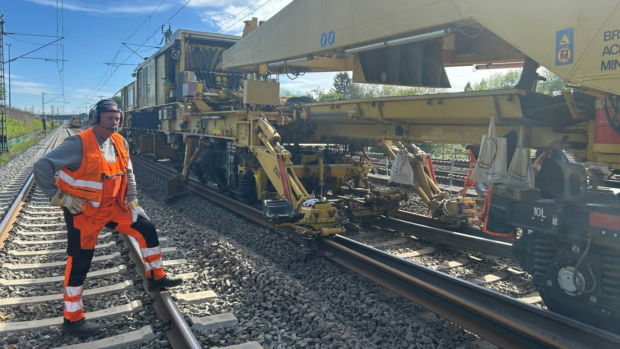 Wir treffen den Umbauzug auf dem Abschnitt zwischen Wuppertal-Oberbarmen und Schwelm, wo die Gleise schnurgerade verlaufen und die parallele S-Bahntrasse weit genug entfernt ist. Bei diesen idealen Bedingungen schafft er 1,8 Kilometer am Tag. Zwischen Gruiten und Leichlingen war er im Einsatz. Und wird jetzt weiter Richtung Hagen fahren. Bis zu 1,8 Kilometer Bahntrasse können mit dem Großgerät in einer Zehn-Stunden-Schicht ausgewechselt werden. Einzig die Schrauben, mit denen das neue Gleis und die Schwellen verbunden sind, müssen noch in Handarbeit angezogen werden.