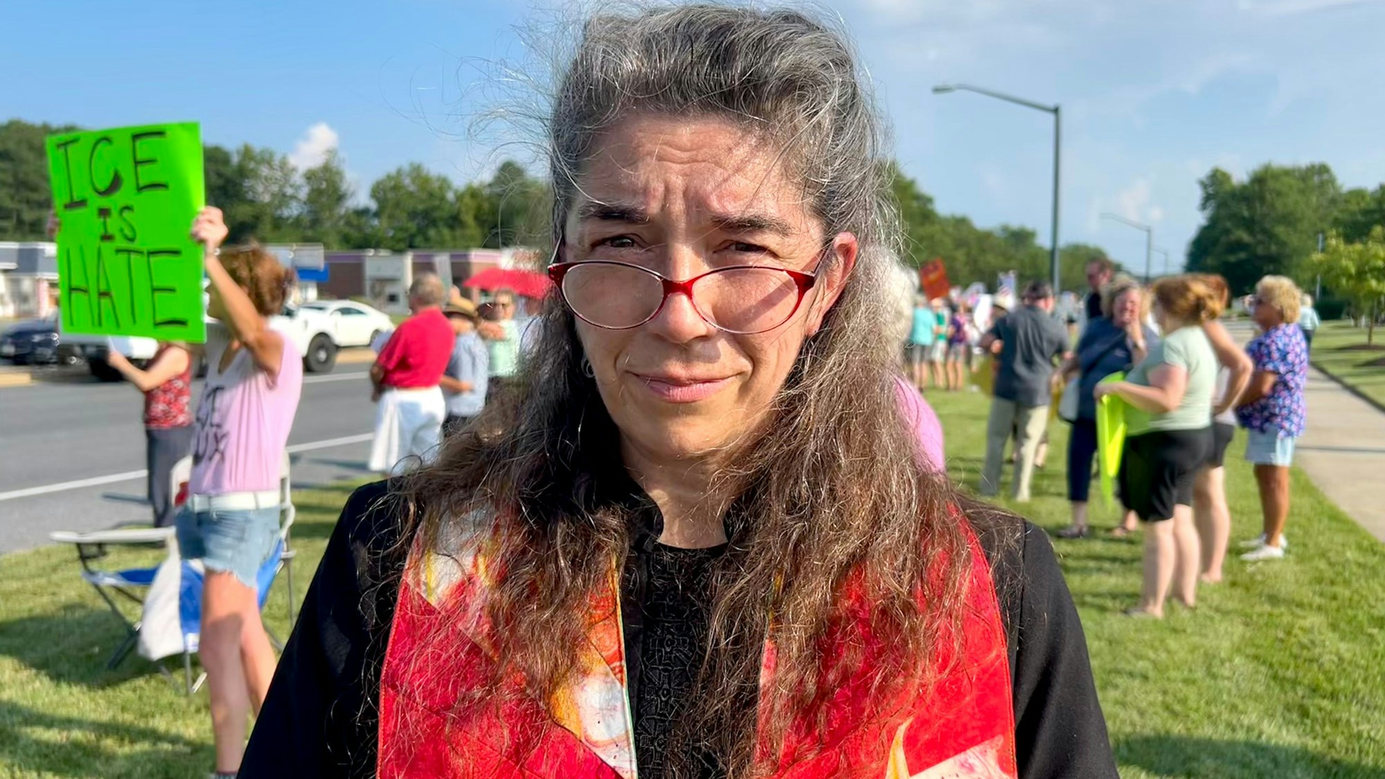"Es ist schockierend, dass ein Mensch, der so lange in diesem Land gelebt hat, einfach von unserer Regierung verschleppt werden kann." Pfarrerin Kathryn Adams ist aus Solidarität mit ihrem Kollegen zu einer Demonstration in Easton gekommen.