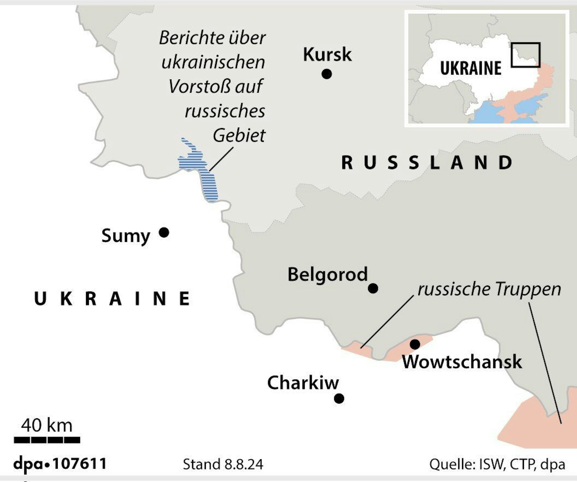 Offiziell hält sich die Ukraine weiterhin bedeckt zu dem Vorstoß auf gegnerisches Gebiet. Im Morgenbericht des Generalstabs wurde die Offensive nicht erwähnt. Experten des amerikanischen Instituts für Kriegsstudien (ISW) bestätigten unterdessen anhand von Informationen in sozialen Netzwerken, dass die ukrainischen Truppen mindestens zehn Kilometer weit auf russisches Gebiet vorgedrungen seien.
