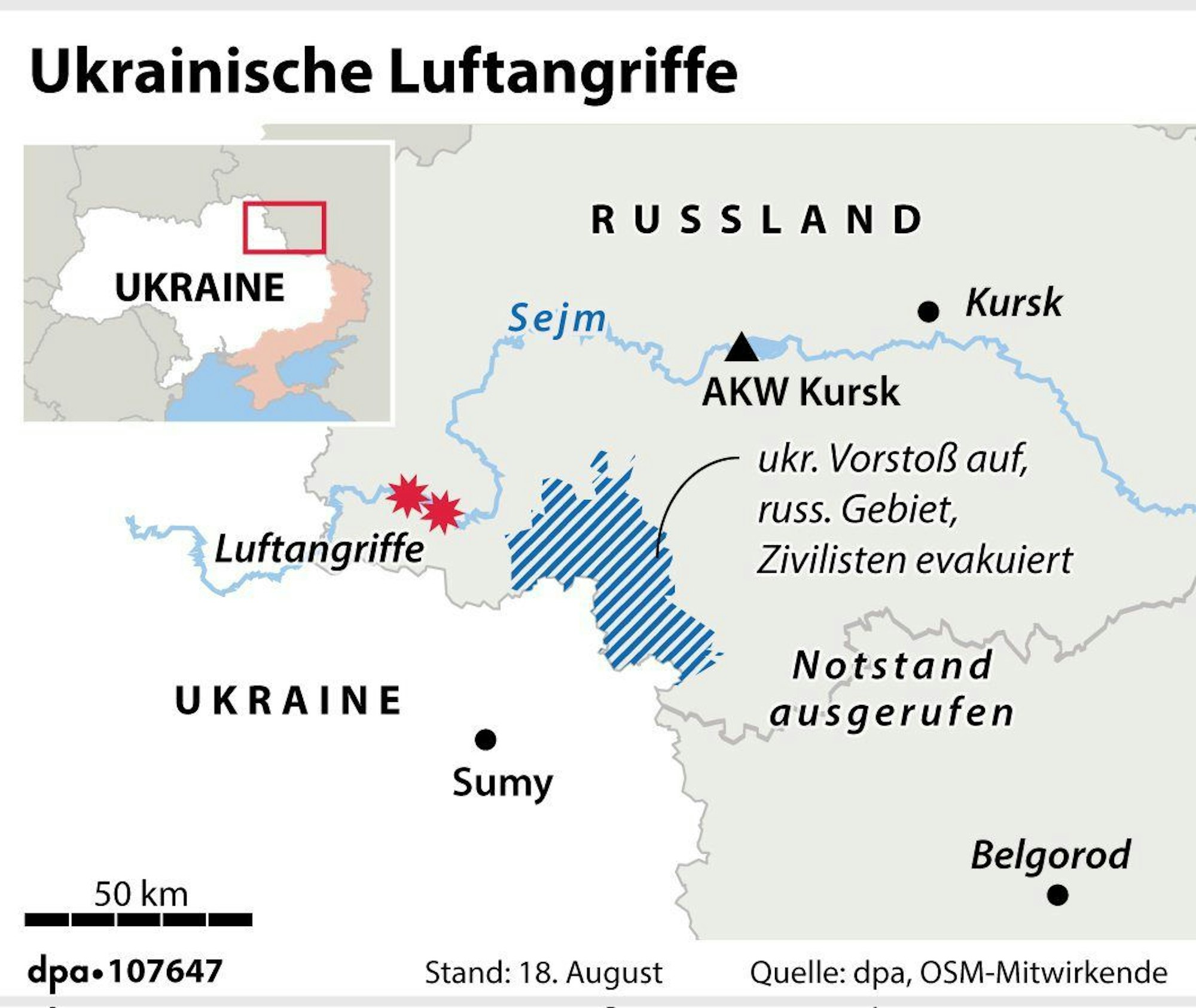 Für weitere inoffizielle Berichte über die Zerstörung auch der dritten Brücke gab es zunächst keine Bestätigung. Nach Angaben russischer und ukrainischer Militärblogger gab es Kämpfe bei der grenznahen Kleinstadt Tjotkino am Sejm. DeepState sah das Dörfchen Otruba auf dem anderen Flussufer unter Kontrolle ukrainischer Truppen.