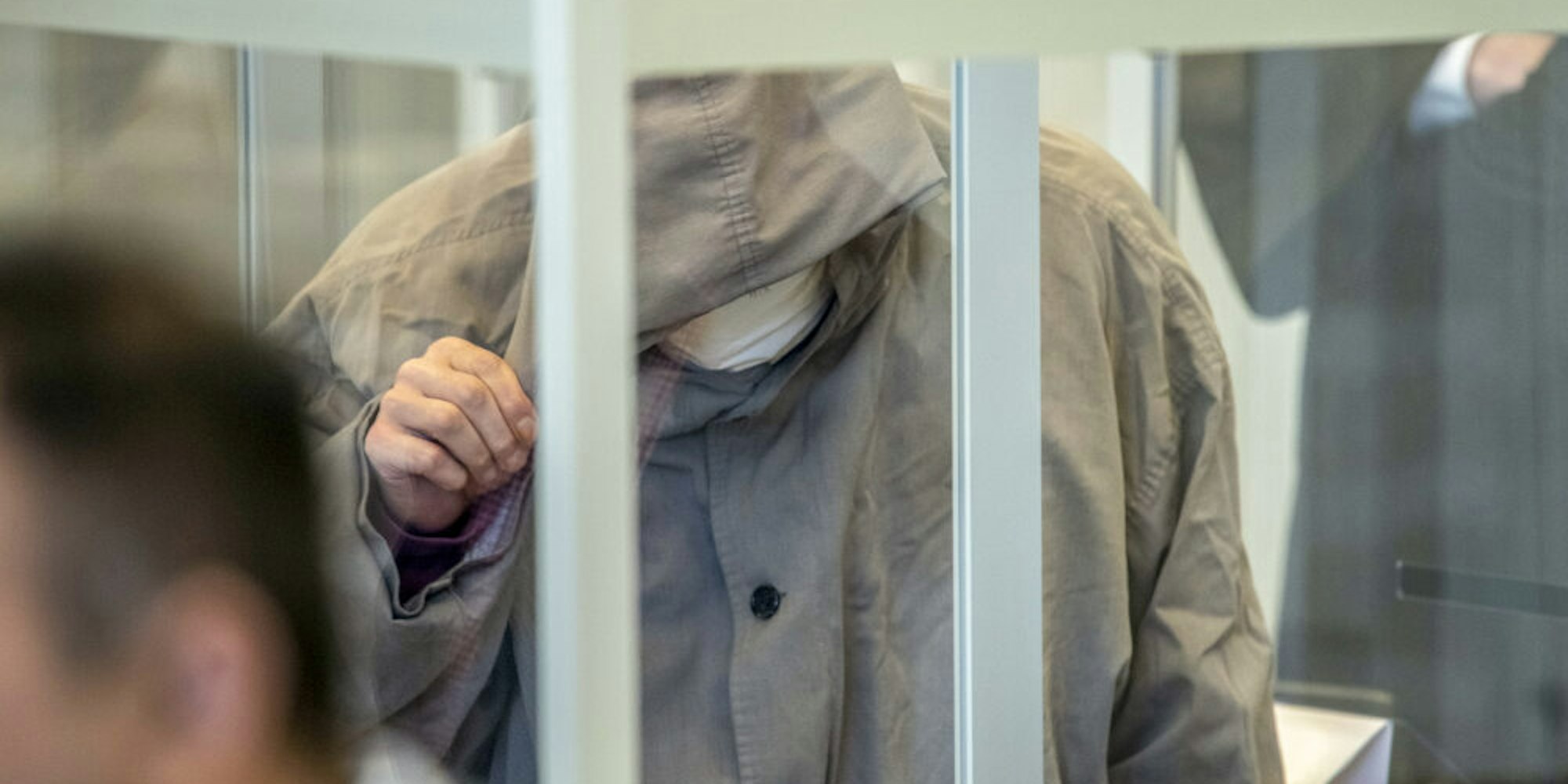 Der syrische Angeklagte Eyad A. verbirgt im Gerichtssaal des Koblenzer Oberlandesgerichts sein Gesicht unter einer Kapuze.