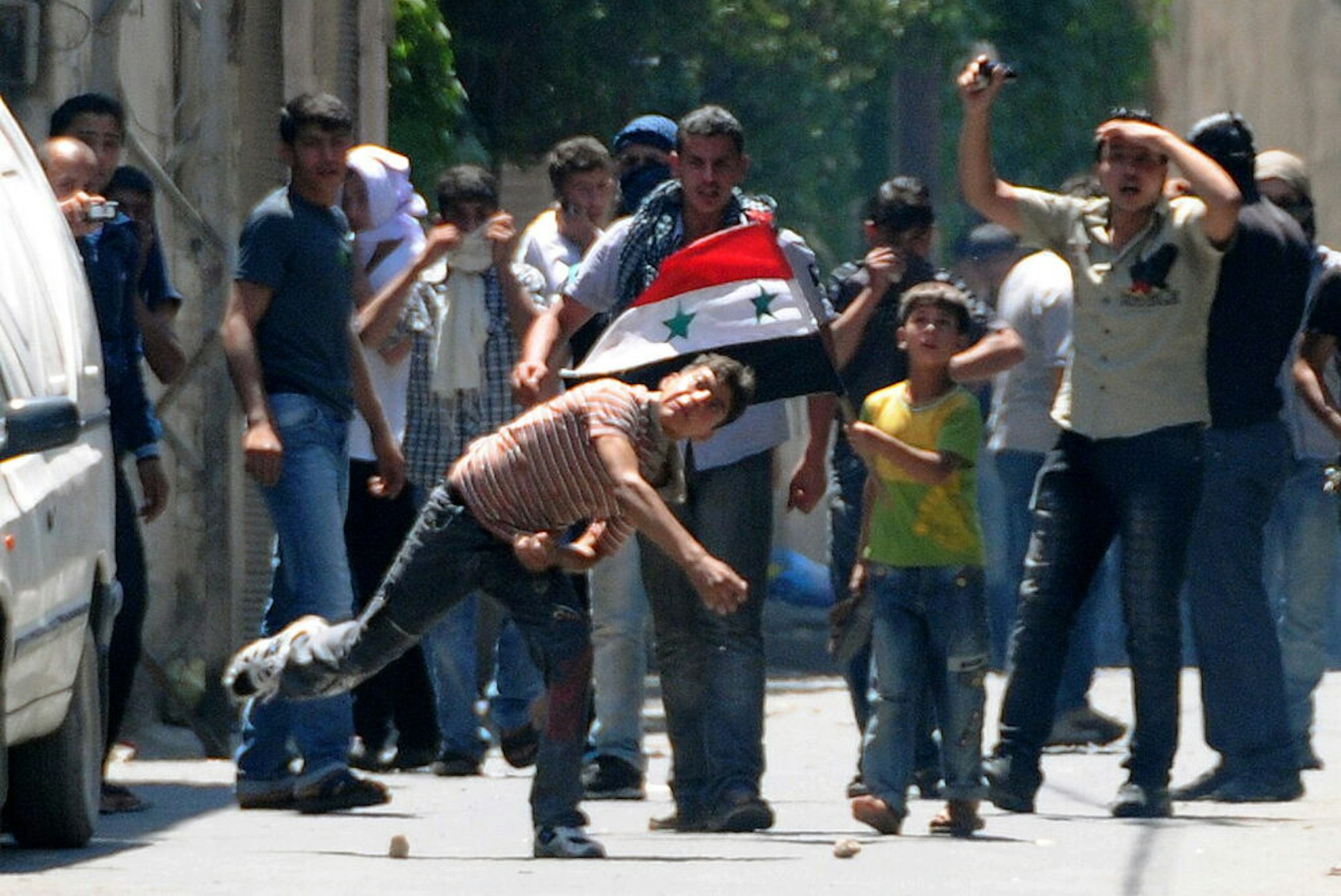 Junge Männer demonstrieren am 1. Juli 2011 in Barzeh, einem Vorort von Damaskus, gegen die syrische Regierung.