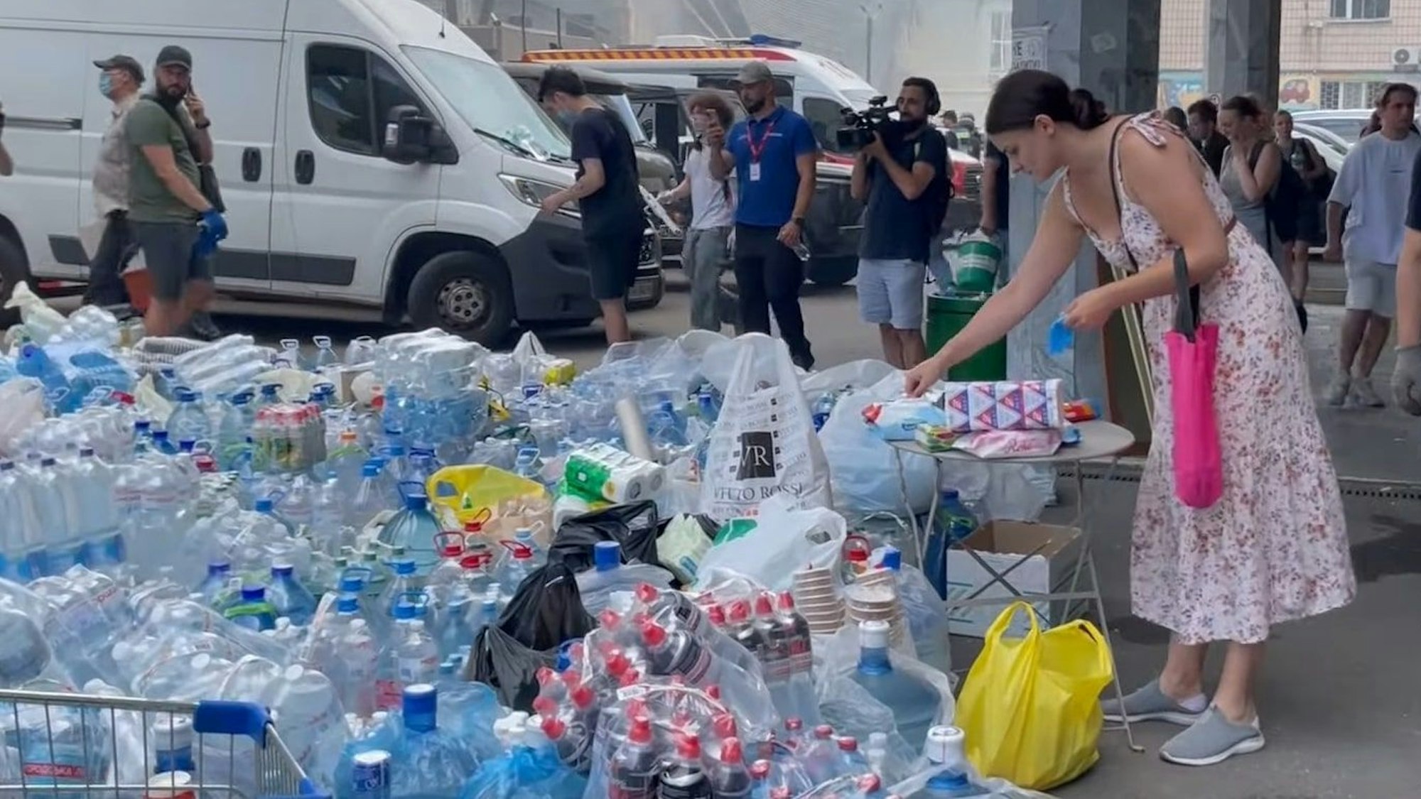 Kiewer Bürger bringen Wasser und andere Hilfsgüter zum Kinderkrankenhaus Okhmatdyt, das am 8. Juli 2024 durch eine russische Rakete schwer getroffen wurde.