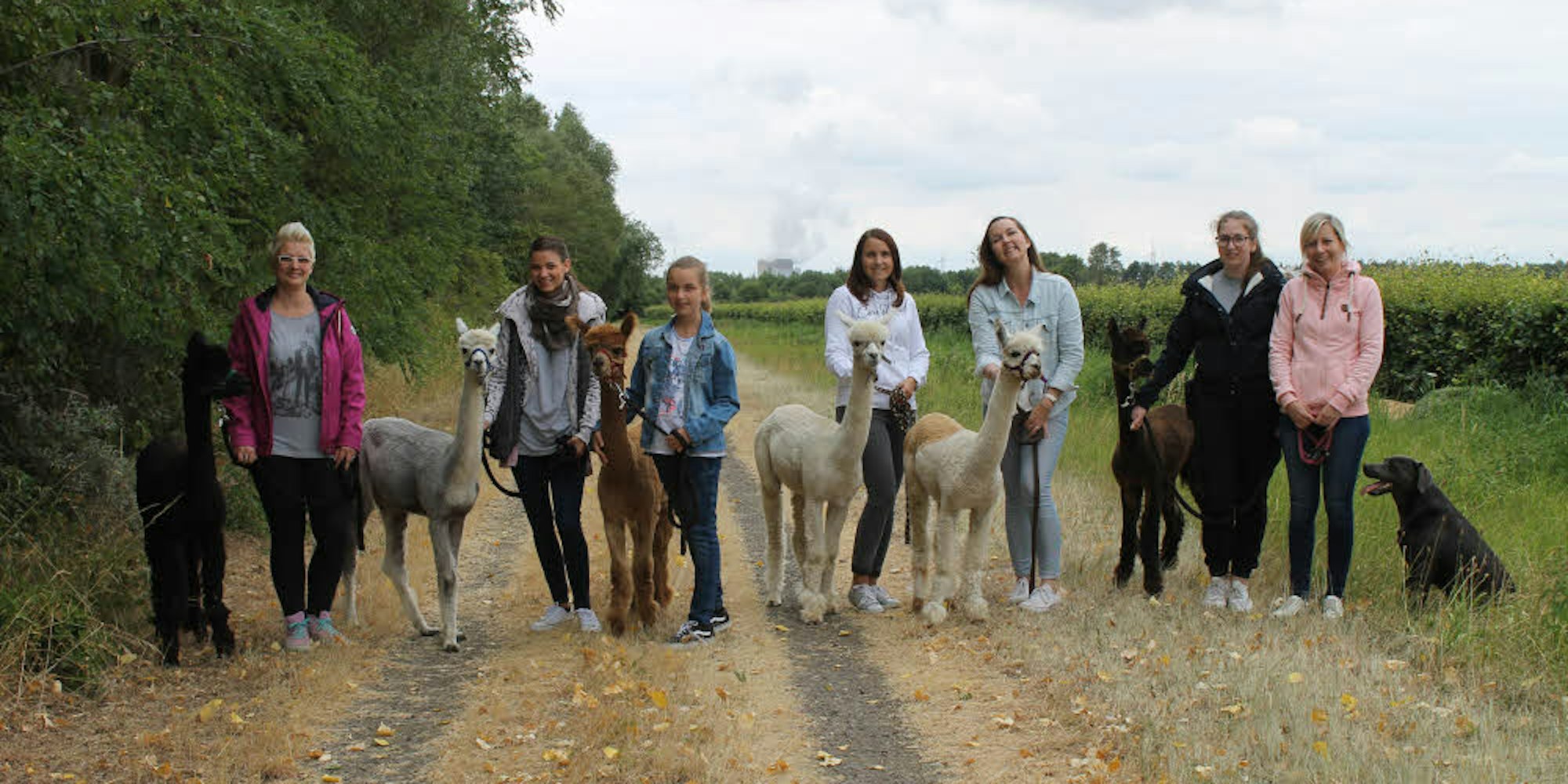 Spazierengehen mit Alpakas macht gute Laune, wie man sieht. Sophie Albels (r.) hat ihre Tiere im Blick.